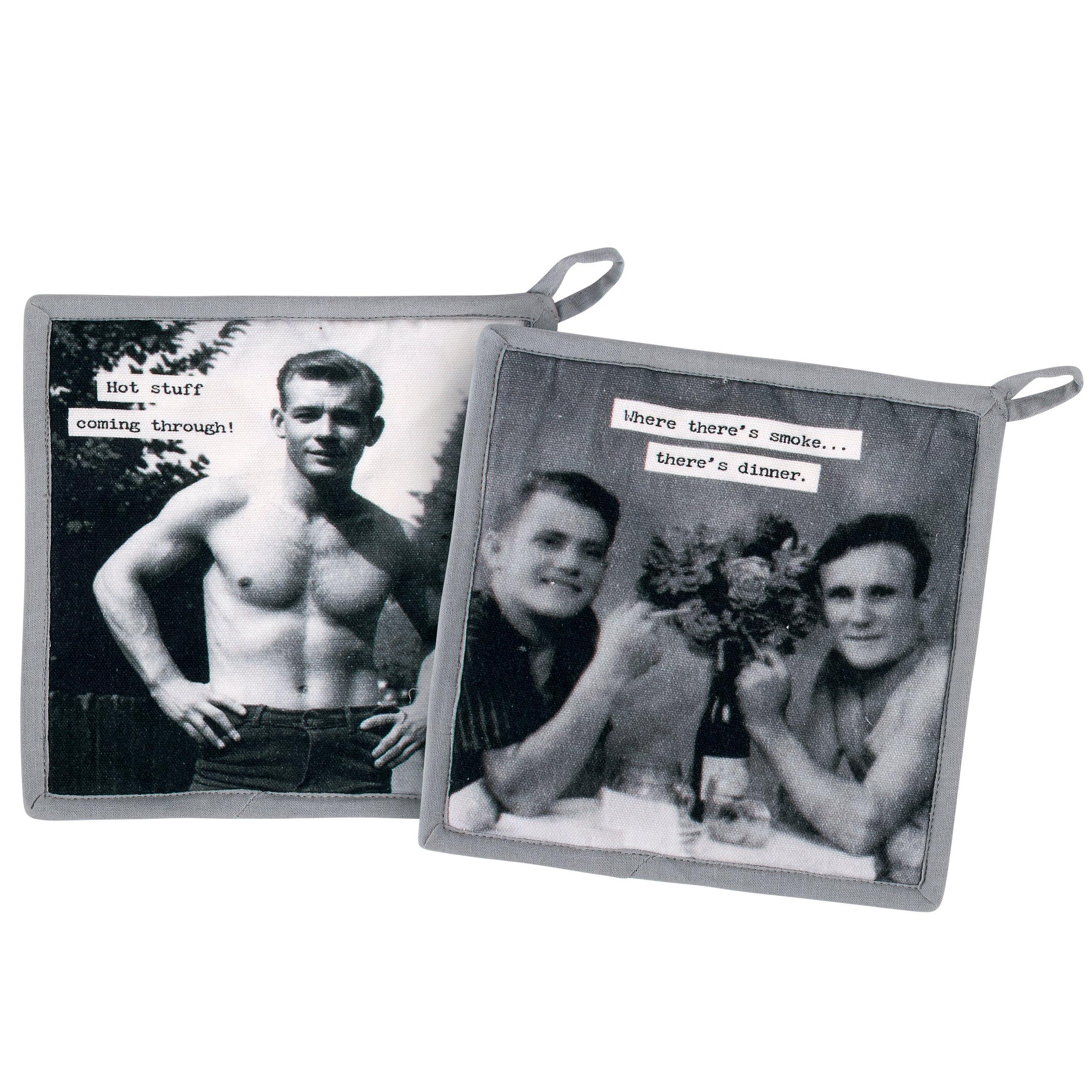 A coordinating hot pad set from our Trash Talk By Annie Collection including two double-sided hot pads displaying vintage black and white photographs complemented with sassy cooking themed sentiments that read "Hot Stuff Coming Through!" and "Where There's Smoke... There's Dinner." Sassy hot pads feature a coordinating retro pattern on the back with gray trim. Our Hot Stuff Coming Through hot pads are conveniently machine-washable for easy cleaning and include a loop on each pad to easily hang. A set of fun kitchen accessories that are great for everyday gifting.