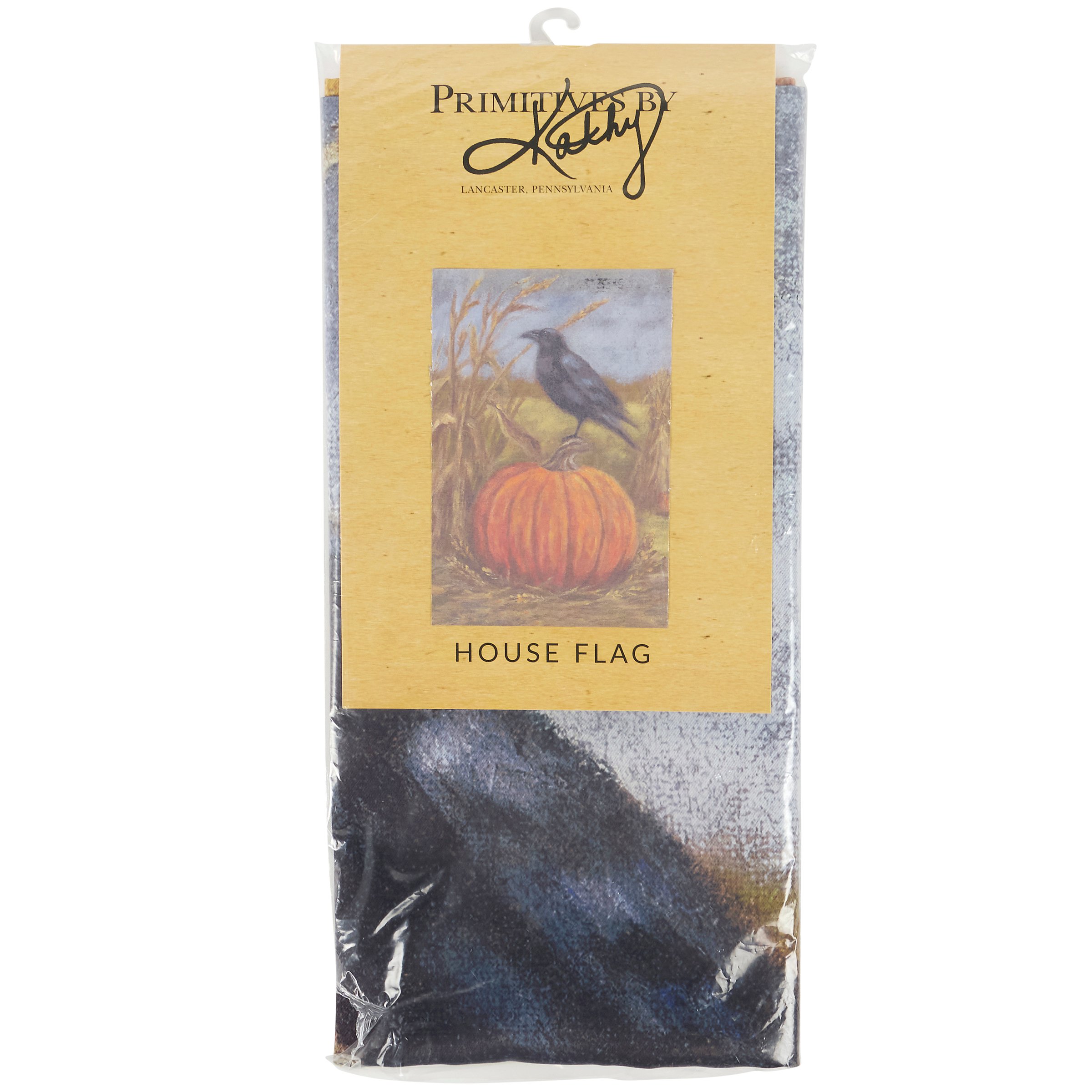 A double-sided polyester house flag from our Halloween Collection displaying an autumn scene of a raven perched on a pumpkin in a harvest field. Halloween design is replicated from original artwork painted onto burlap canvas, giving the art a unique depth and texture. Seasonal house flag is weather-resistant and features inside loops that connect to hooks on our House Flag Pole and keep the flag in an open position. Our Raven On Pumpkin house flag is packaged in a polybag folded up with a header card displaying full flag design and a hook to easily hang on rack for store display. Hand wash only. A rustic Halloween home accent perfect for seasonal display.