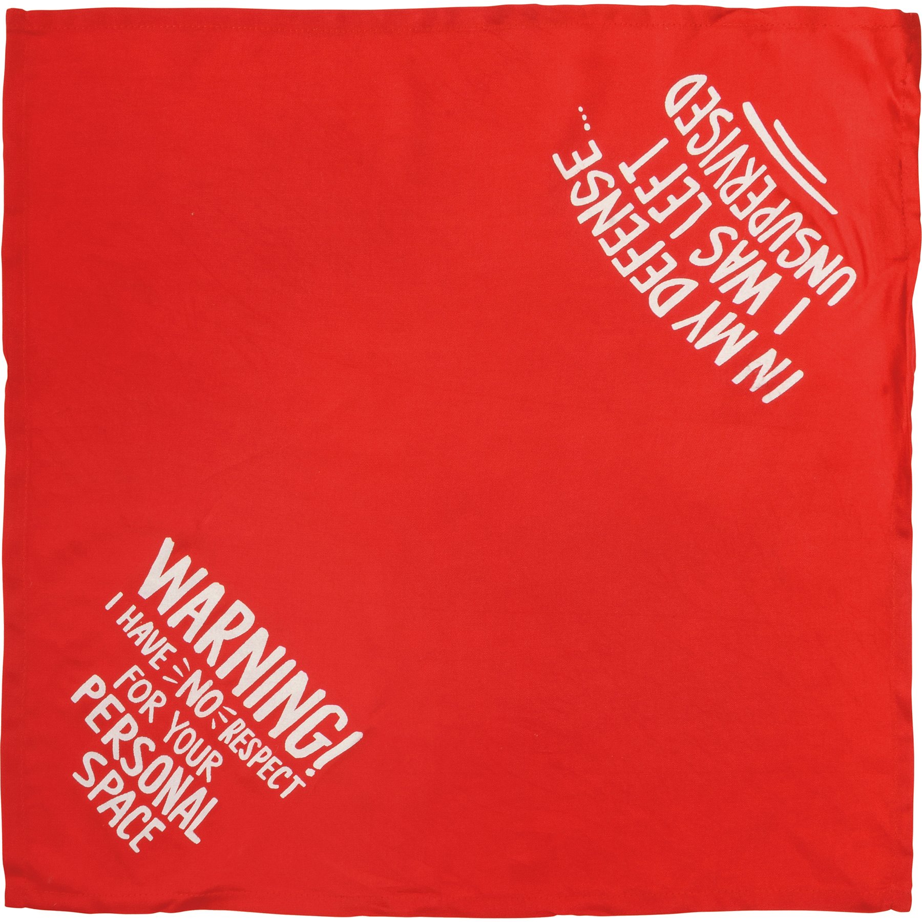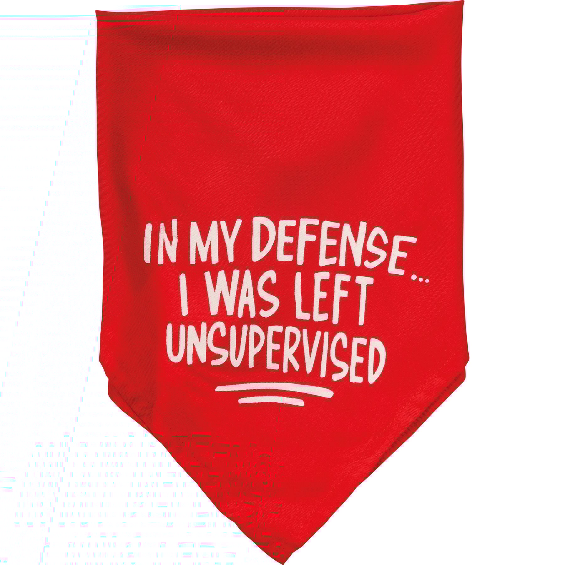 A small reversible pet bandana featuring hand lettered "Warning! I Have No Respect For Your Personal Space" and "In My Defense…I Was Left Unsupervised" sentiments on opposite corners. 16" x 16". Made of soft rayon to resist dirt. Machine-washable.