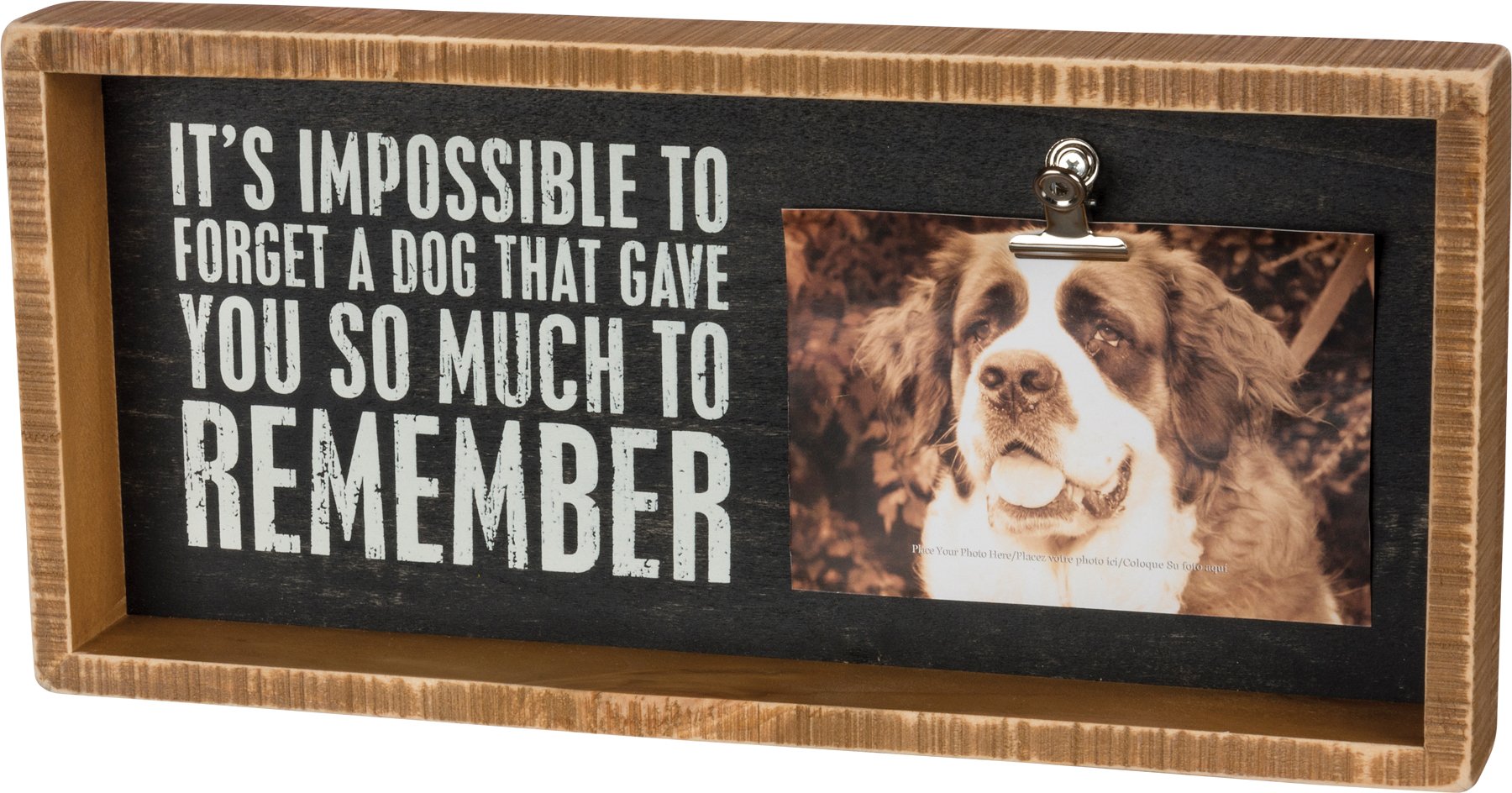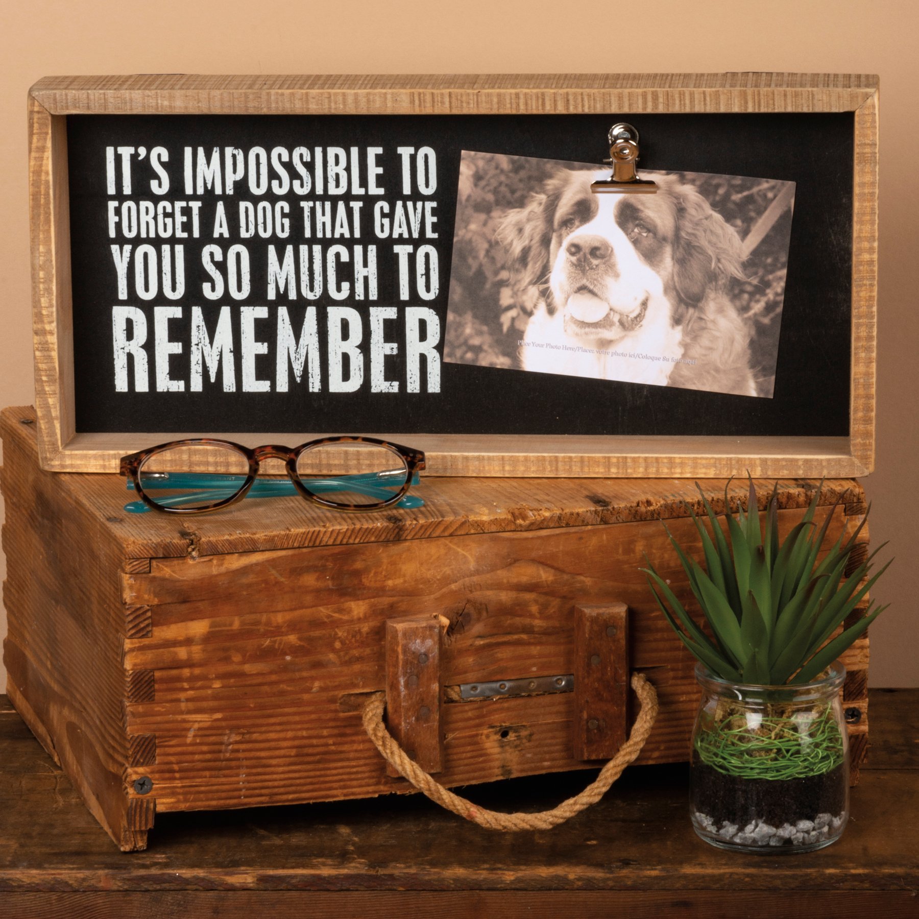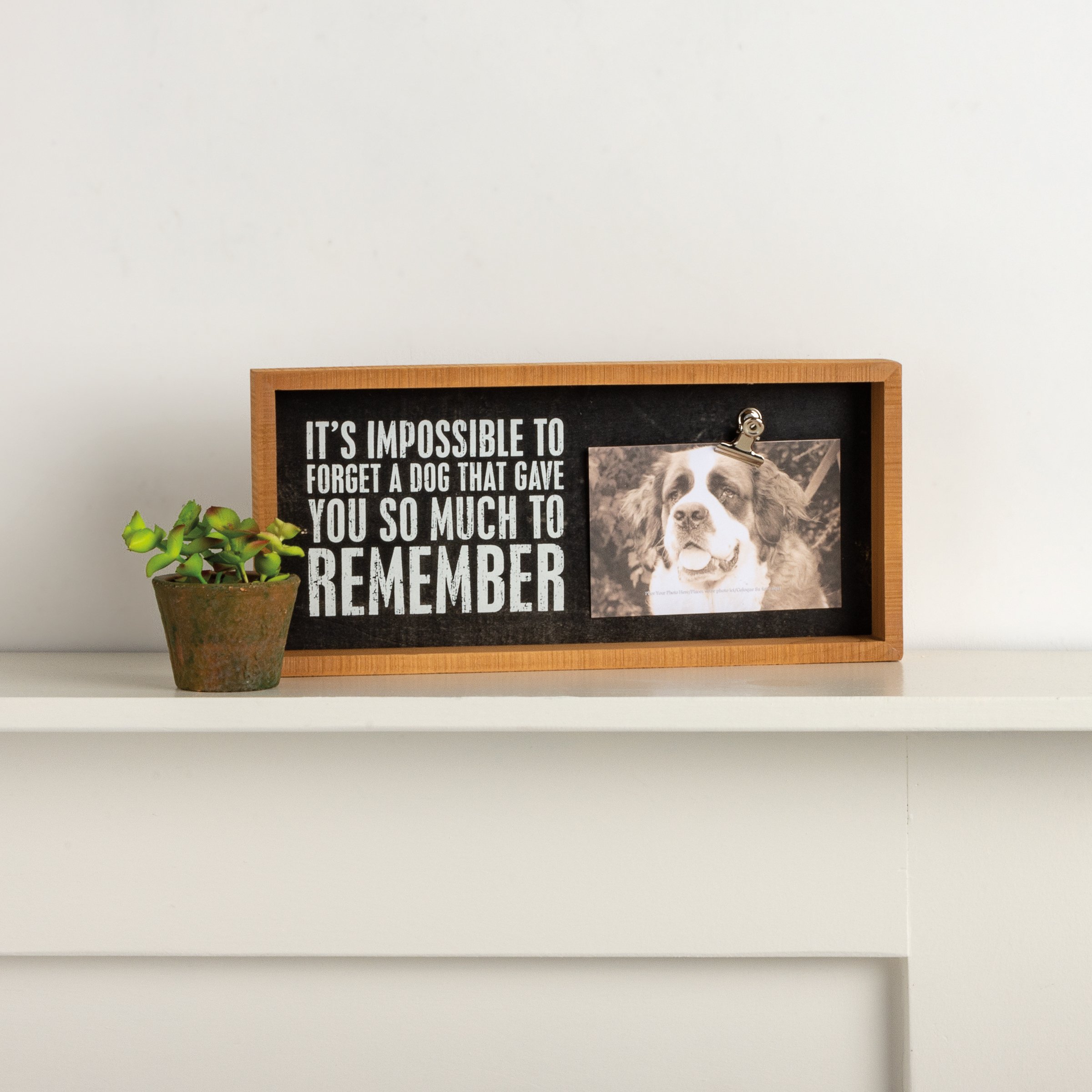 An inset box sign picture frame lending a classic black and white distressed "It's Impossible To Forget A Dog That Gave You So Much To Remember" sentiment with natural wood trim accent. Contains metal clip for displaying a 6" x 4" photo and complements well with existing decor for a great gift!