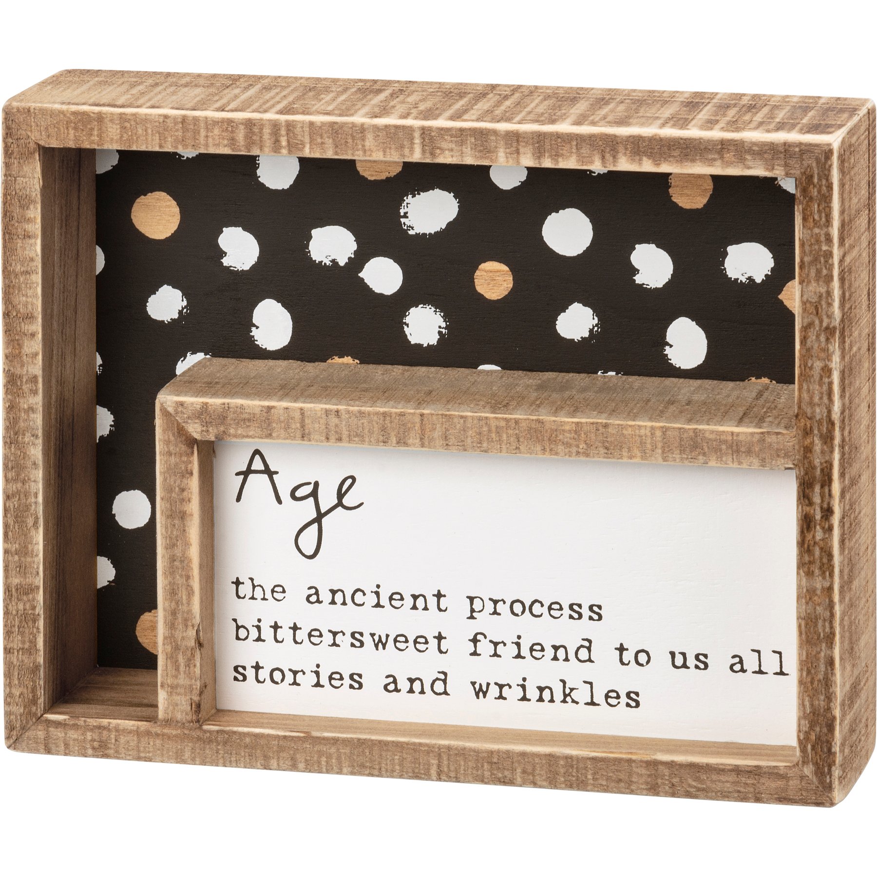 A double-inset box sign featuring a geometric pattern on the background with a front panel for a haiku poem. Poem reads "Age The Ancient Process Bittersweet Friend To Us All Stories And Wrinkles." Easy to hang or can free-stand alone.
