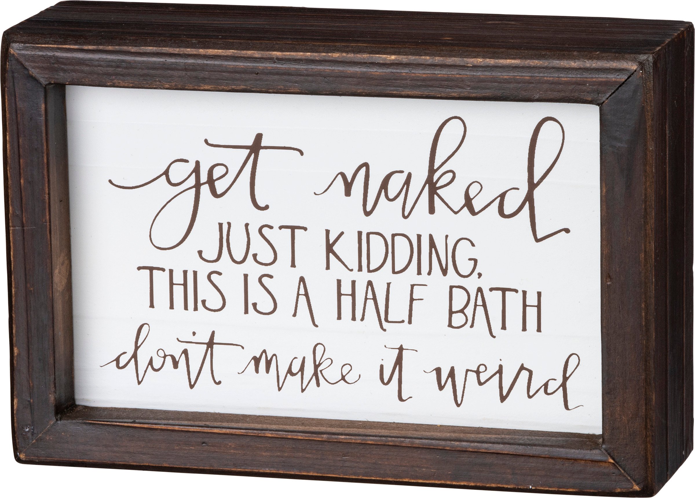 A wooden inset box sign featuring an engraved "Get Naked - Just Kidding, This Is A Half Bath Don't Make It Weird" sentiment and tile-like finish. Complements well with other pieces in collection to create a cohesive display. Not eligible for discounting.