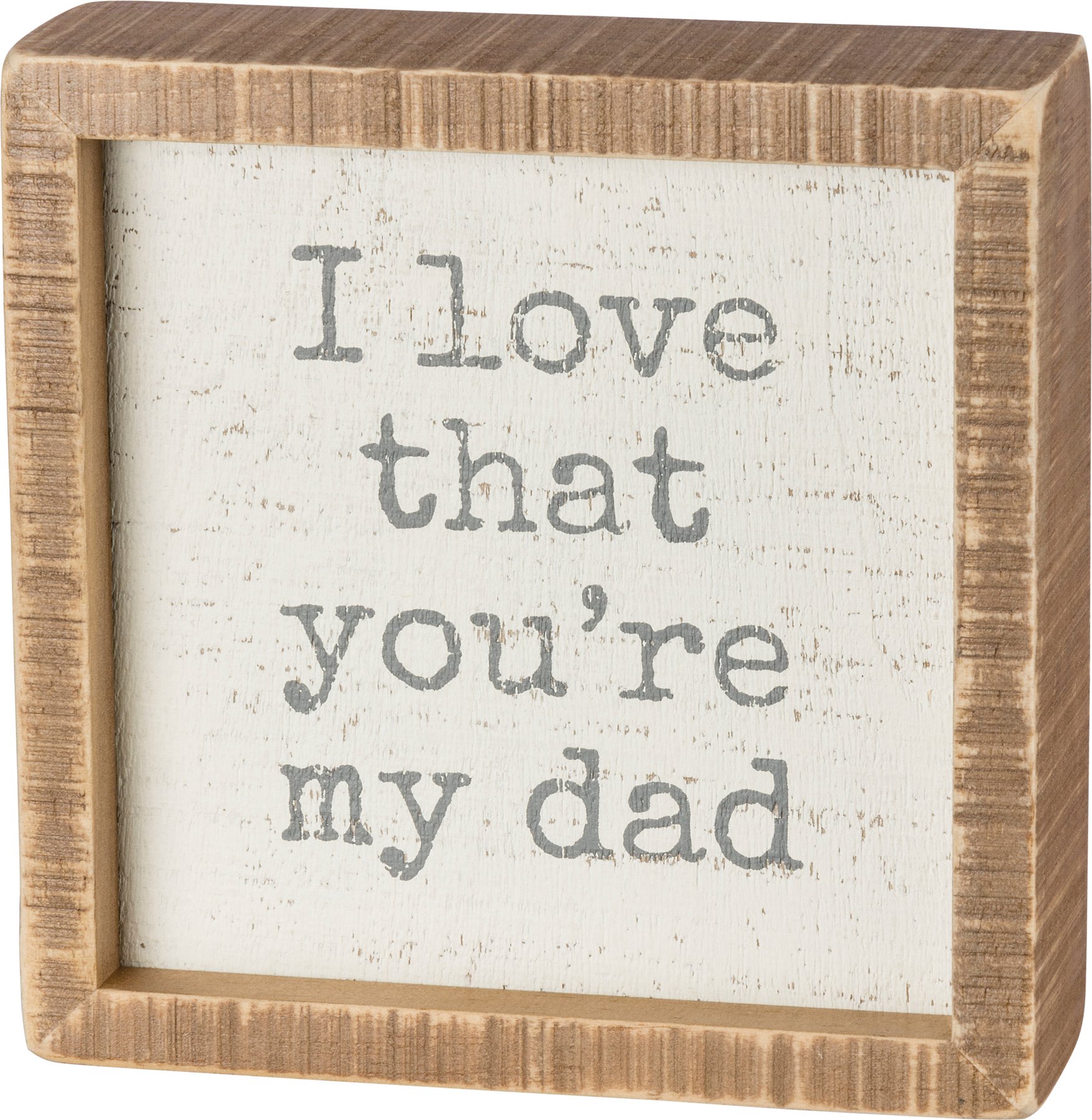 A wooden box sign lending an inset "I Love That You're My Dad" sentiment. Easy to hang or can free-stand alone on a shelf or mantel. Complements well with coordinating design pieces for a thoughtful gift set.