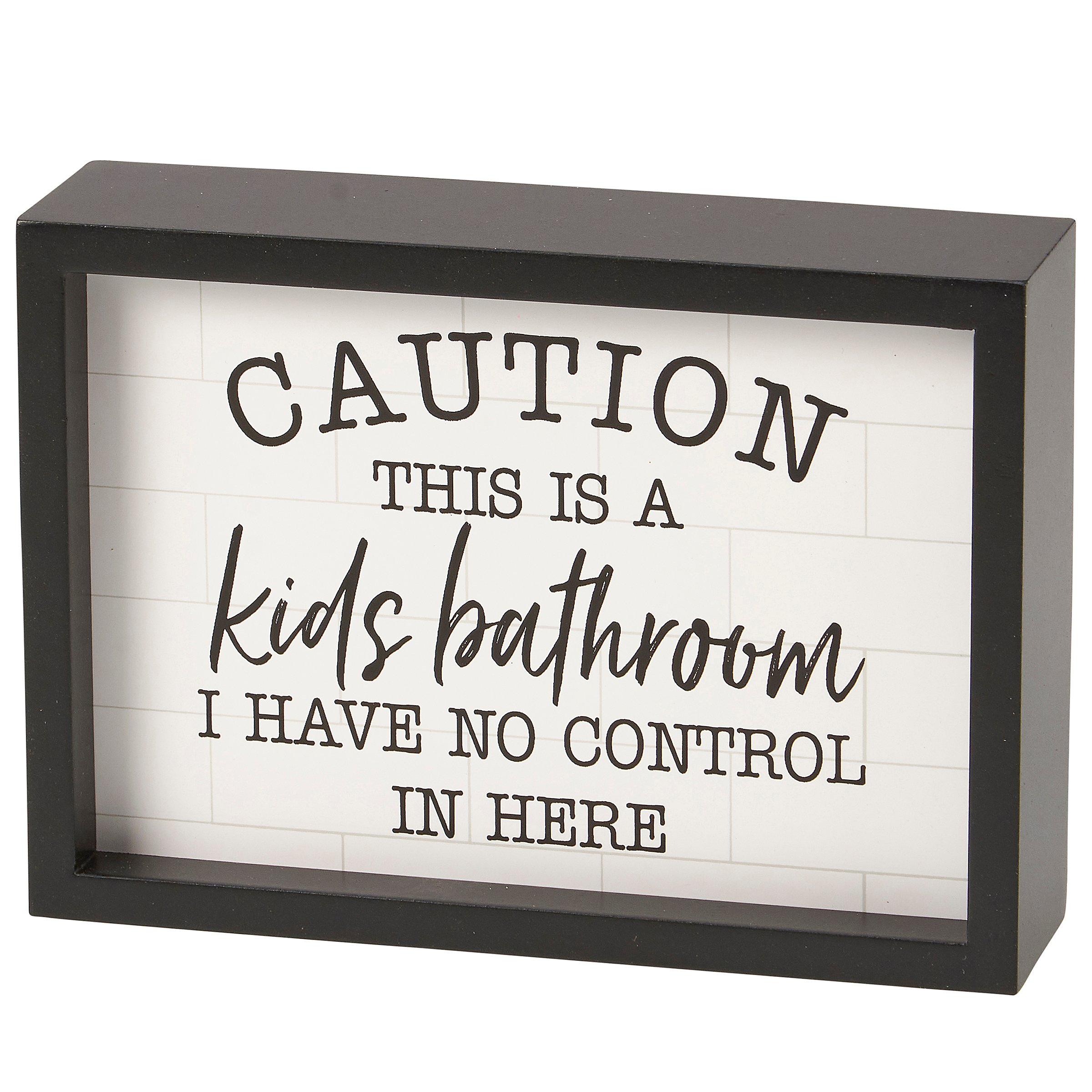 A funny box sign from our Room by Room Collection featuring a black color wood frame and inset design of a tile-like background with a funny kids bathroom inspired sentiment that reads "Caution - This Is A Kids Bathroom - I Have No Control In Here." Our Kids Bathroom sign is easy to hang or can free-stand on a flat surface for display. A fun home accent perfect for kids' bathroom decor. Not eligible for discounting.