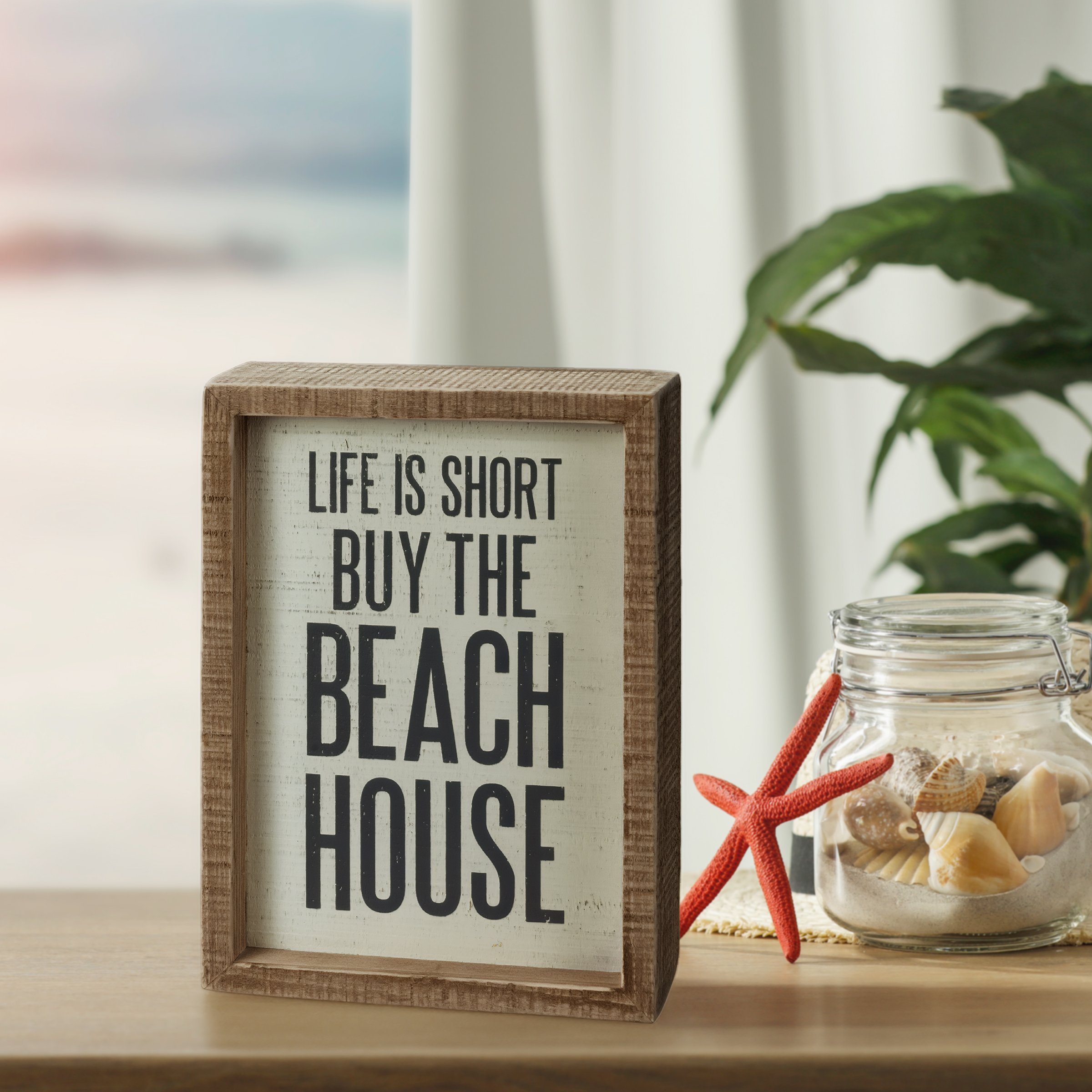 An inset wooden box sign featuring "Life Is Short Buy The Beach House" sentiment on a distressed cream background. Easy to hang or can free-stand alone.