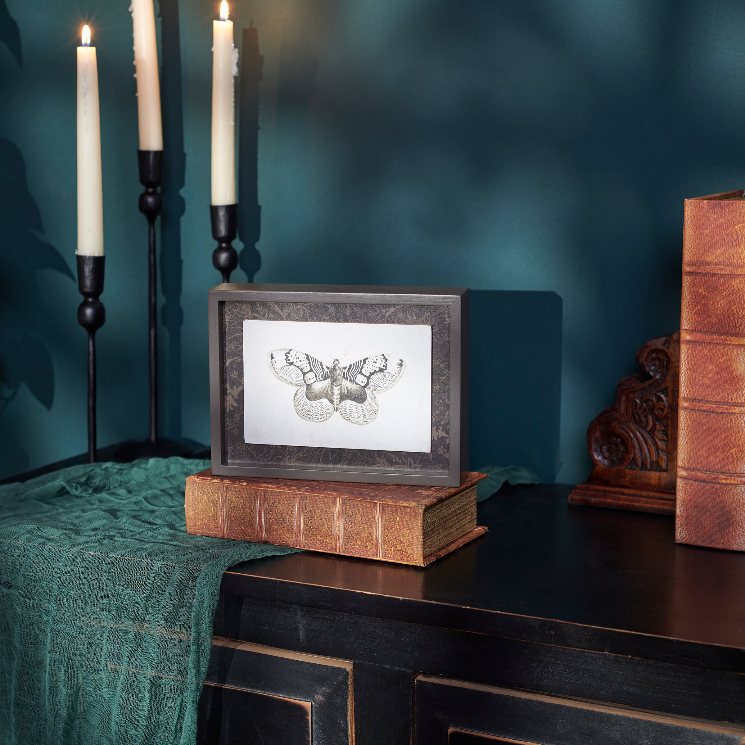 An inset box sign from our Moody Collection featuring a dark gray wood frame and inset design with a leaf pattern background and a center design placed on a raised section for dimensional detail. Center design displays a vintage sketch of a moth. Our Moth inset box sign is easy to hang or can free-stand alone. A dark academia inspired home accent that can be easily displayed in any home or work space.