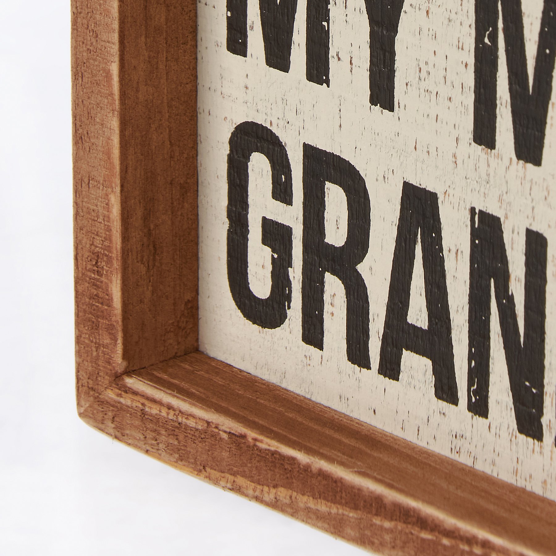 An inset box sign from our Box Sign Style Collection featuring a natural wood frame and inset design of a box sign style sentiment with dry brushed cream color background. Design displays humorous sentiment that reads "I'm So Tired Of Babysitting My Mom's Grandkids." Our My Mom's Grandkids inset box sign is easy to hang or can free-stand alone. A fun everyday home accent with a variety of display options.