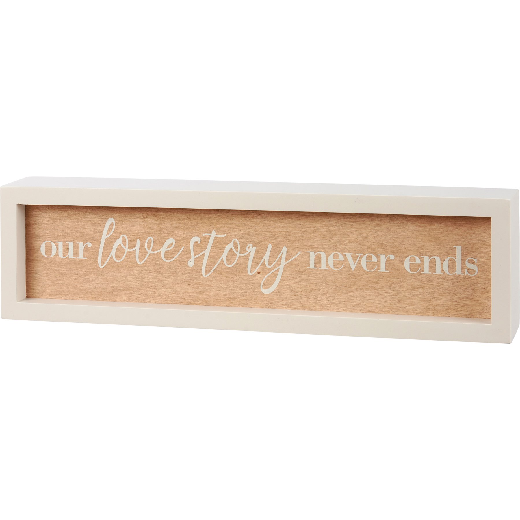 An inset box sign from our Wedding Collection displaying a heart-warming sentiment on natural wood background that reads "Our Love Story Never Ends." Box sign features cream color frame with inset design. Our Love Story Never Ends inset box sign is easy to hang or can free-stand alone. A lovely option for a wedding gift or an everyday home accent with a variety of display options.