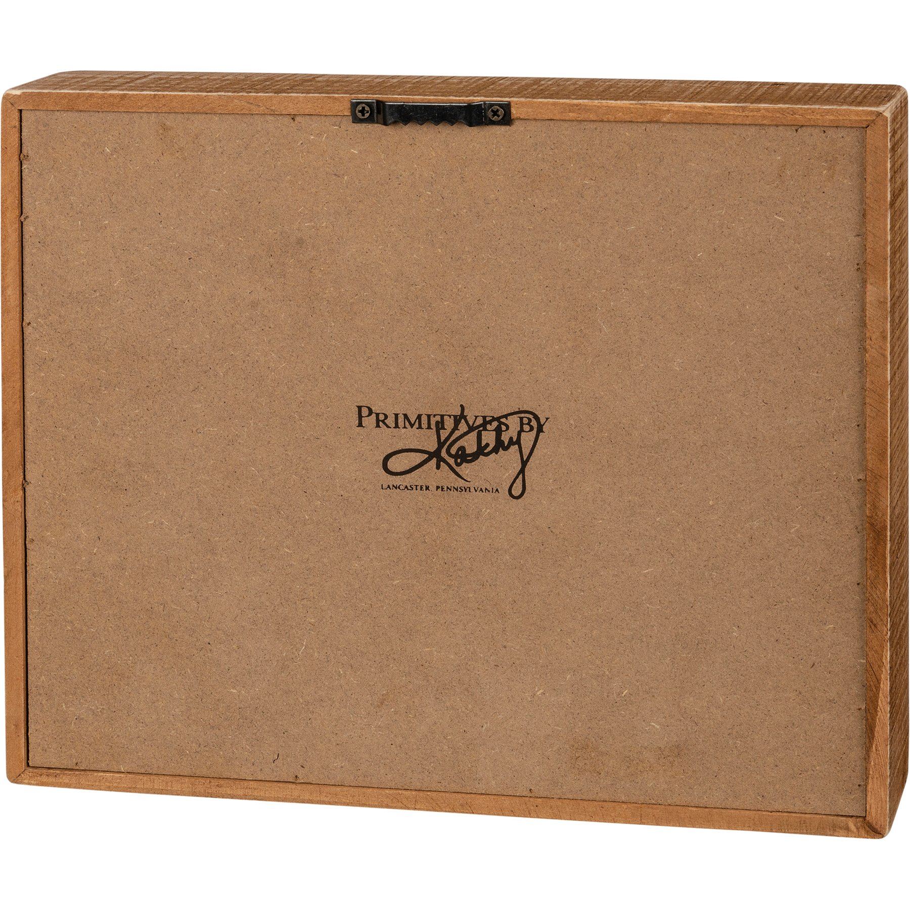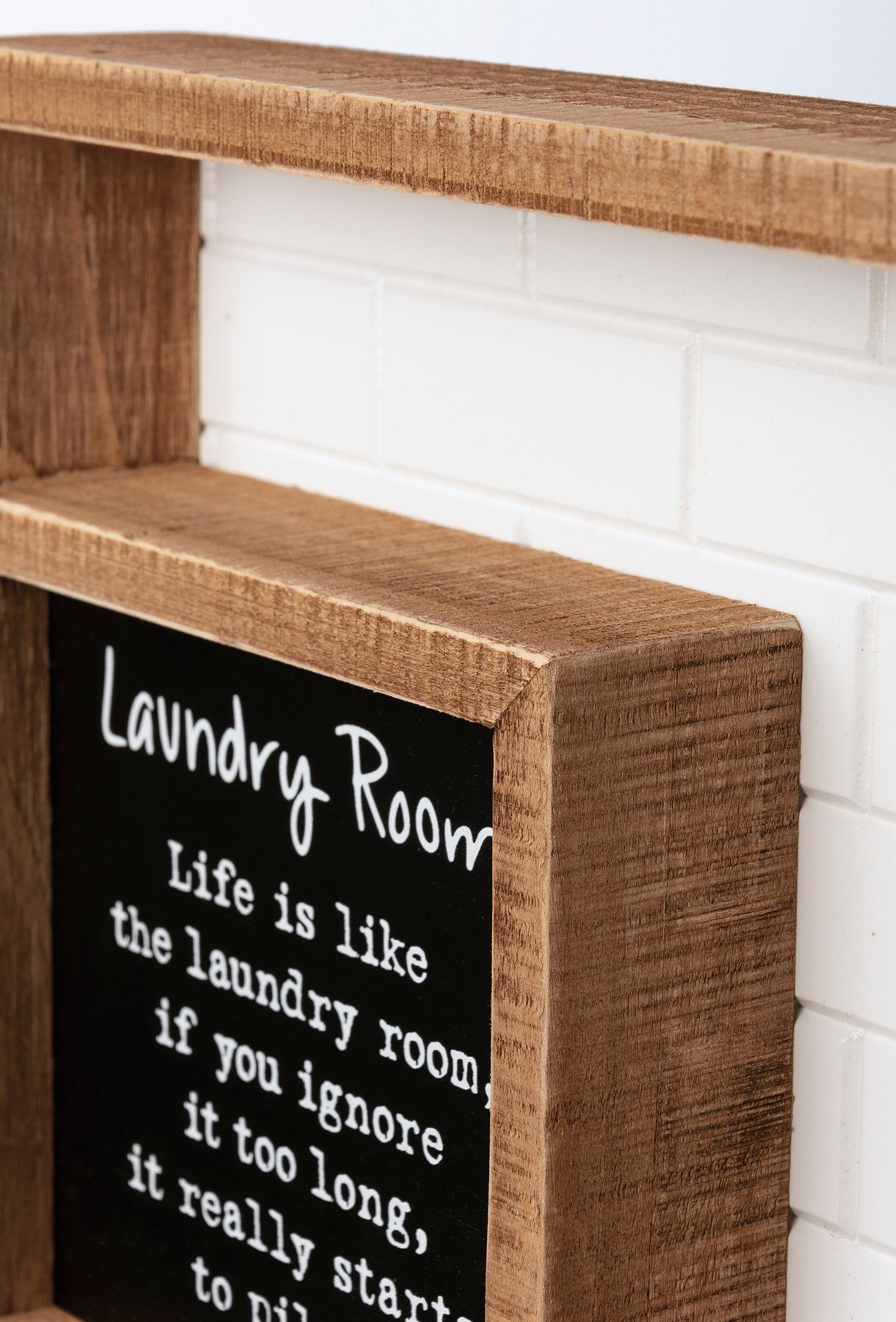 A double inset wooden box sign featuring a tile-like enamel background with a front panel for a poem. Poem reads "Laundry Room Life Is Like The Laundry Room, If You Ignore It Too Long, It Really Starts To Pile Up." Easy to hang or can free-stand alone.