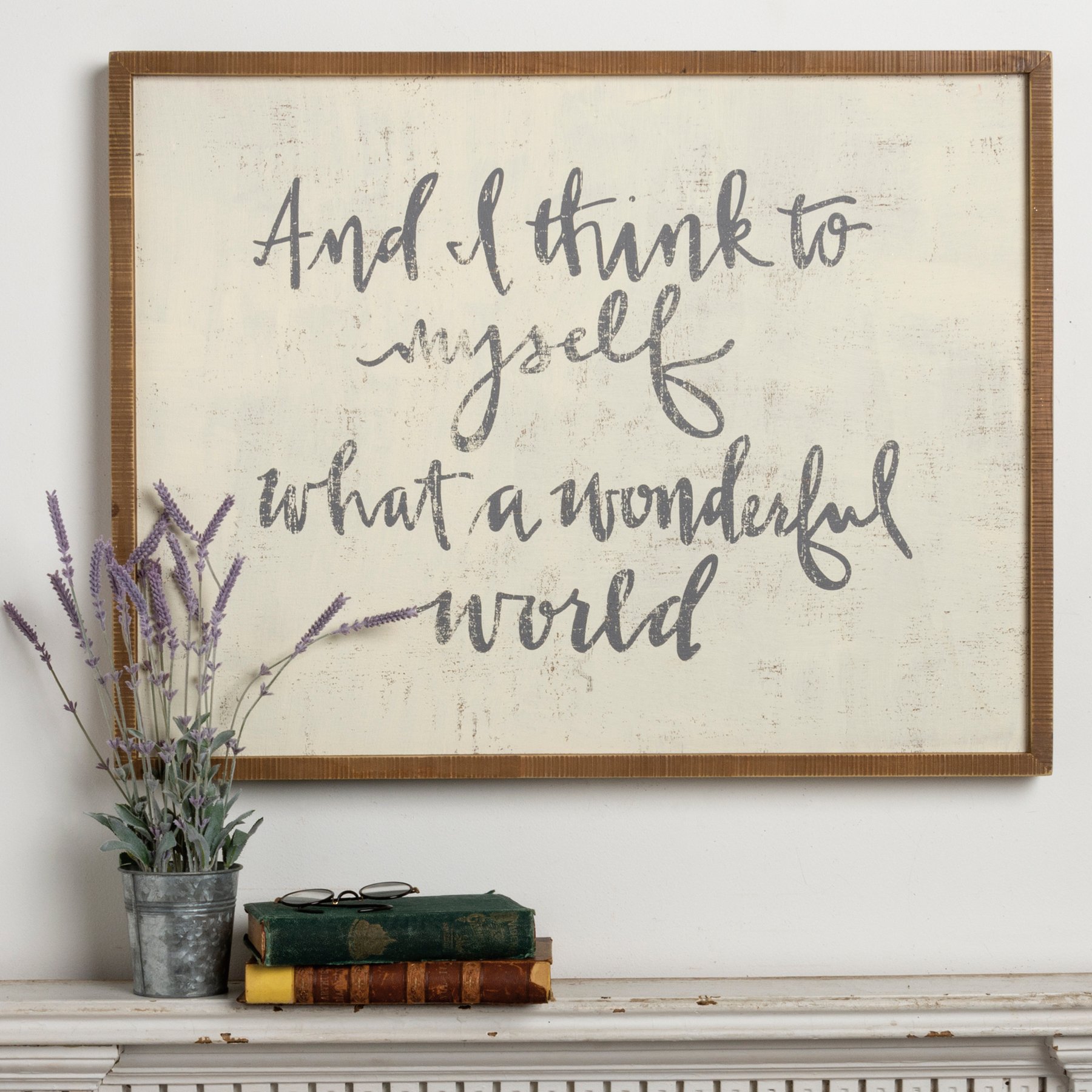 A wooden box sign featuring an inset accent, distressed "And I Think To Myself What A Wonderful World" hand lettered sentiment, neutral palette, and natural wood trim. Complements well with existing decor or coordinating design pieces. Easy to hang or can free-stand alone.
