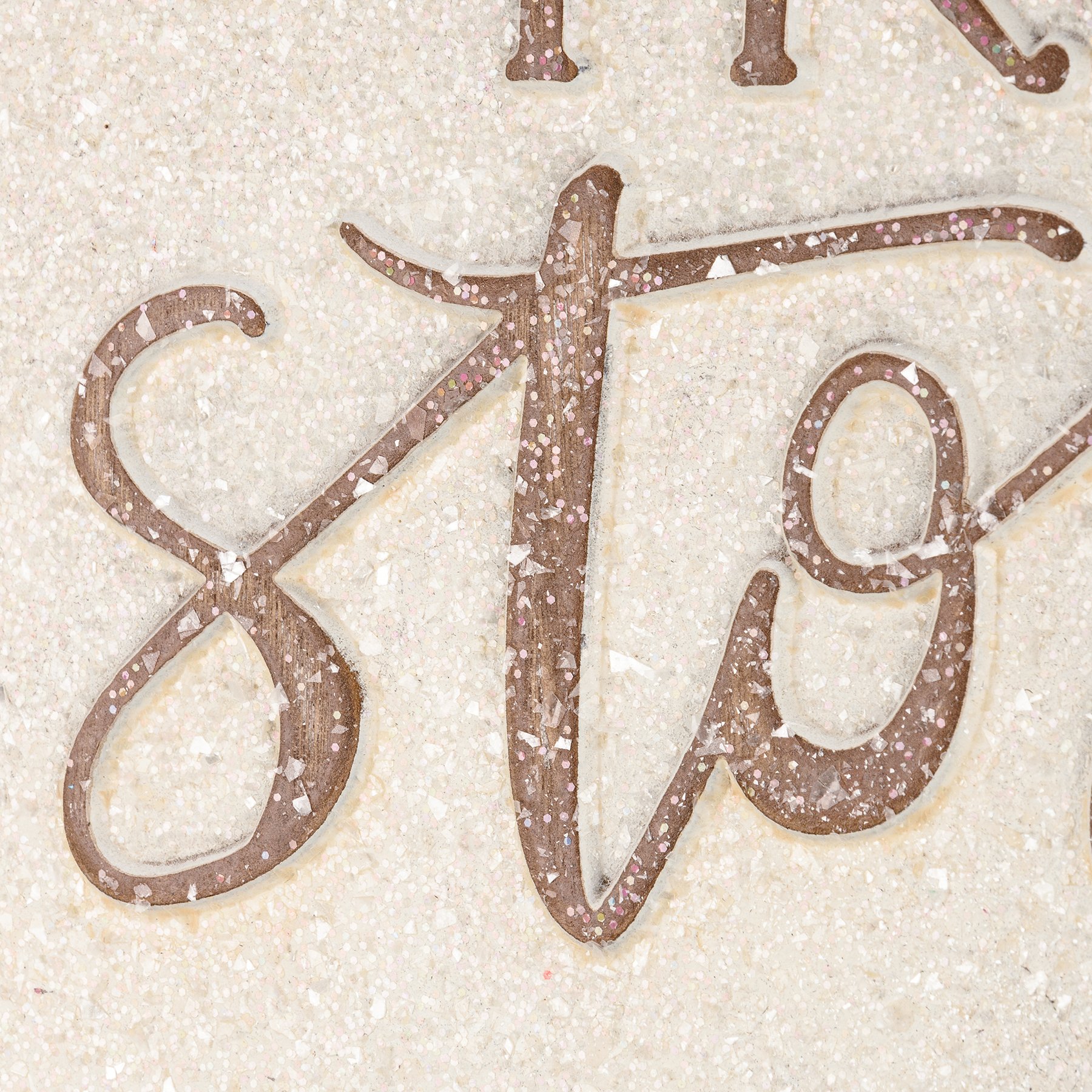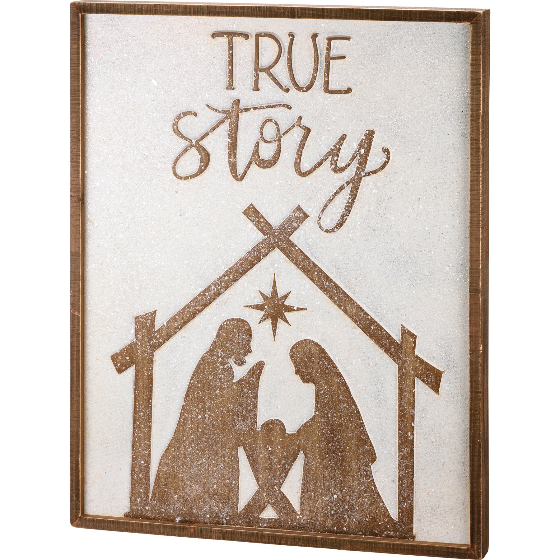 An inset wooden box sign featuring an embossed "True Story" sentiment and nativity scene design with an all-over mica coating for a snowy effect. Our True Story inset box sign is easy to hang or can free-stand alone.