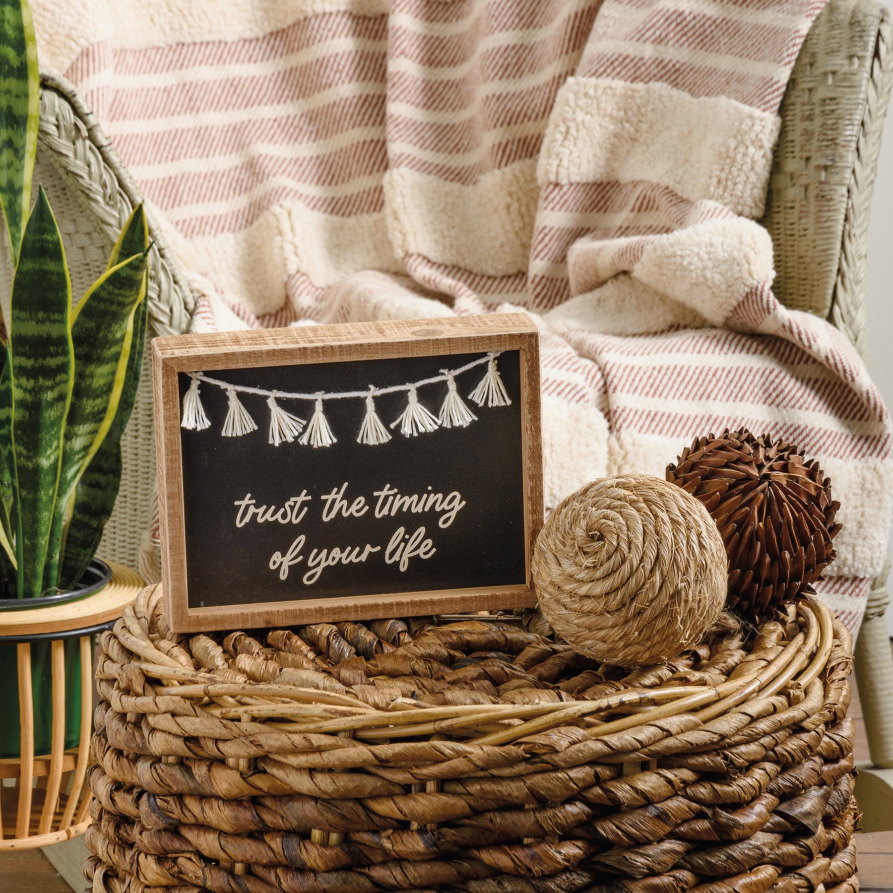 An inset wooden box sign from our Bohemian Collection features an inspirational "Trust The Timing Of Your Life" sentiment, brown background, macrame tassel fringe accents, and natural wood sides for added interest. Our Your Life inset box sign is easy to hang or can free-stand alone. Not eligible for discounting.