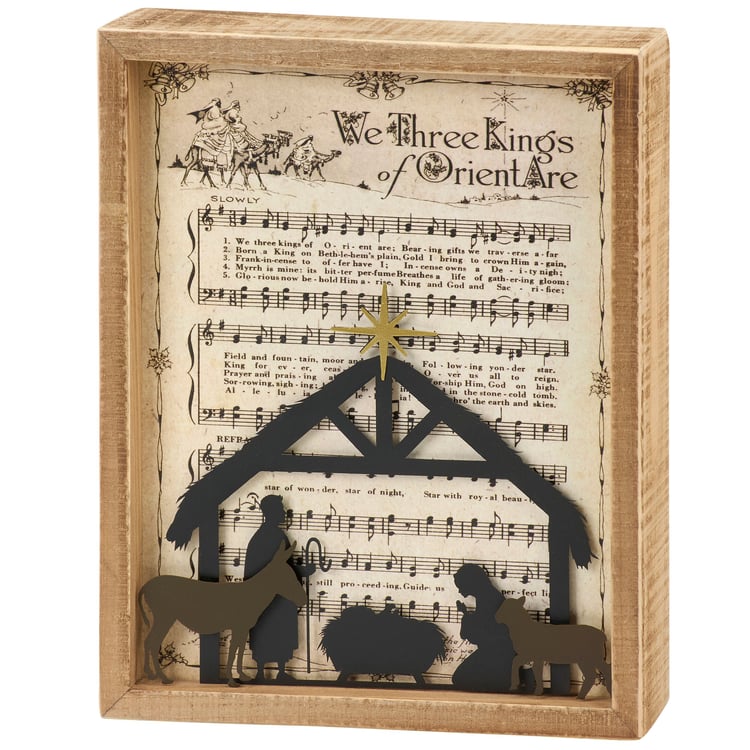 An inset box sign from our Christmas Collection featuring an inset design displaying vintage sheet music for "We Three Kings" behind cutout metal pieces creating a nativity scene. Frame is made with natural wood with distressed details. Our We Three Kings inset box sign is easy to hang or can free-stand on a flat surface for display. A nativity themed home accent that can be easily displayed to add seasonal style to any home or work space.