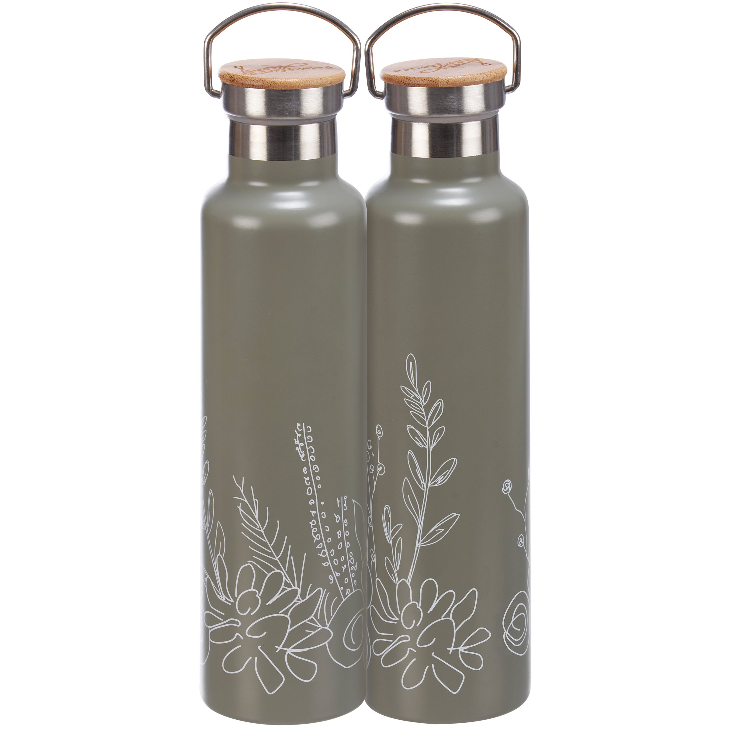 An insulated, double-walled stainless steel floral water bottle and coordinating lid with bamboo top layer. Featured in our Cottagecore Collection, our bottle displays hand illustrated design of wildflowers on matte green. Our Floral water bottle keeps beverages cold for 24 hours and hot for 12 hours. Hand-wash only and DO NOT MICROWAVE.