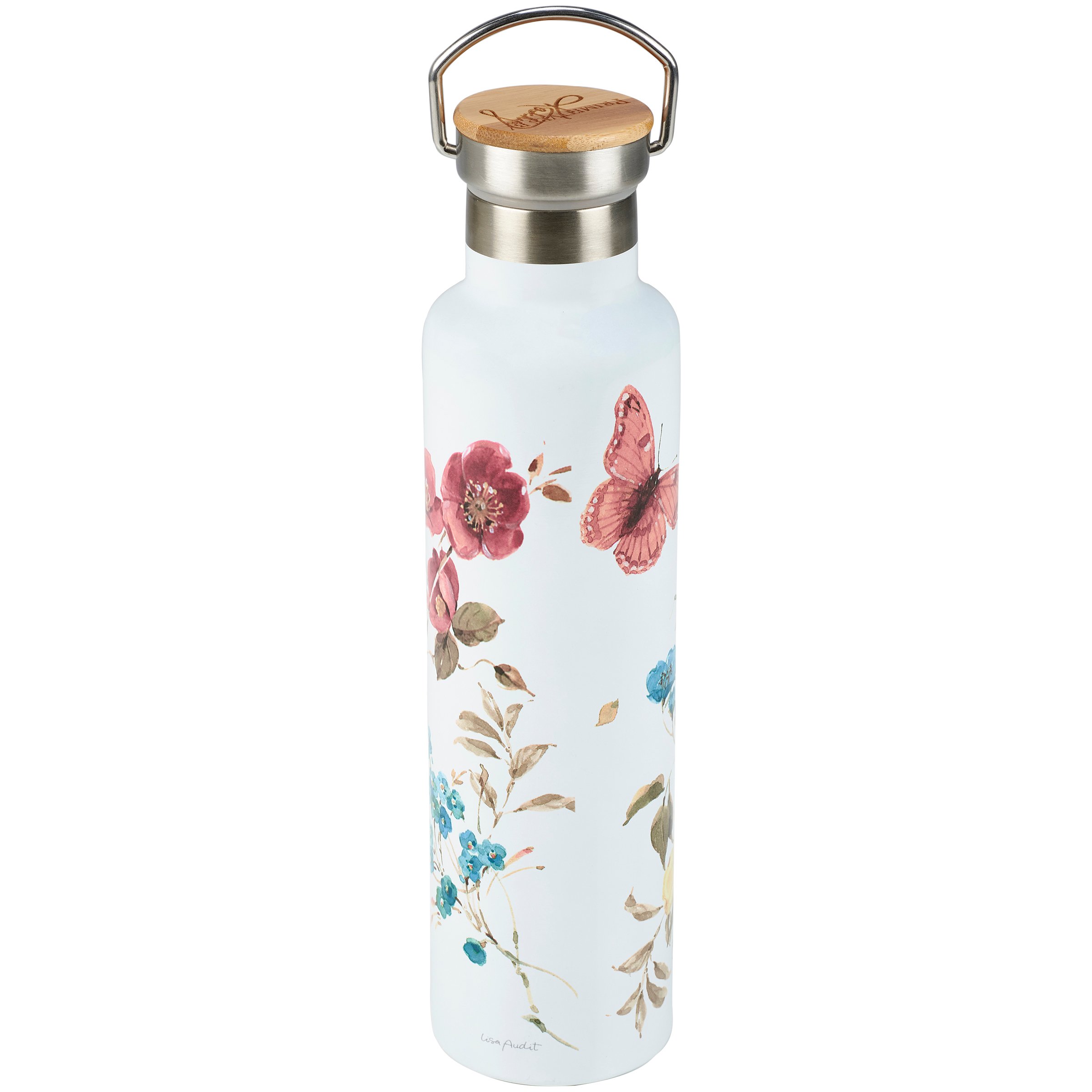 An insulated, double-walled stainless steel water bottle and coordinating lid with bamboo top layer. Featured in our Watercolor Collection, our bottle displays a full wrap-around design of a butterfly and colorful flowers hand painted in delicate watercolor style. Our Florals insulated bottle keeps up to 25 oz beverages cold for 24 hours and hot for 12 hours. Hand-wash only; do not microwave. A lovely everyday accessory perfect for on-the-go or at home.