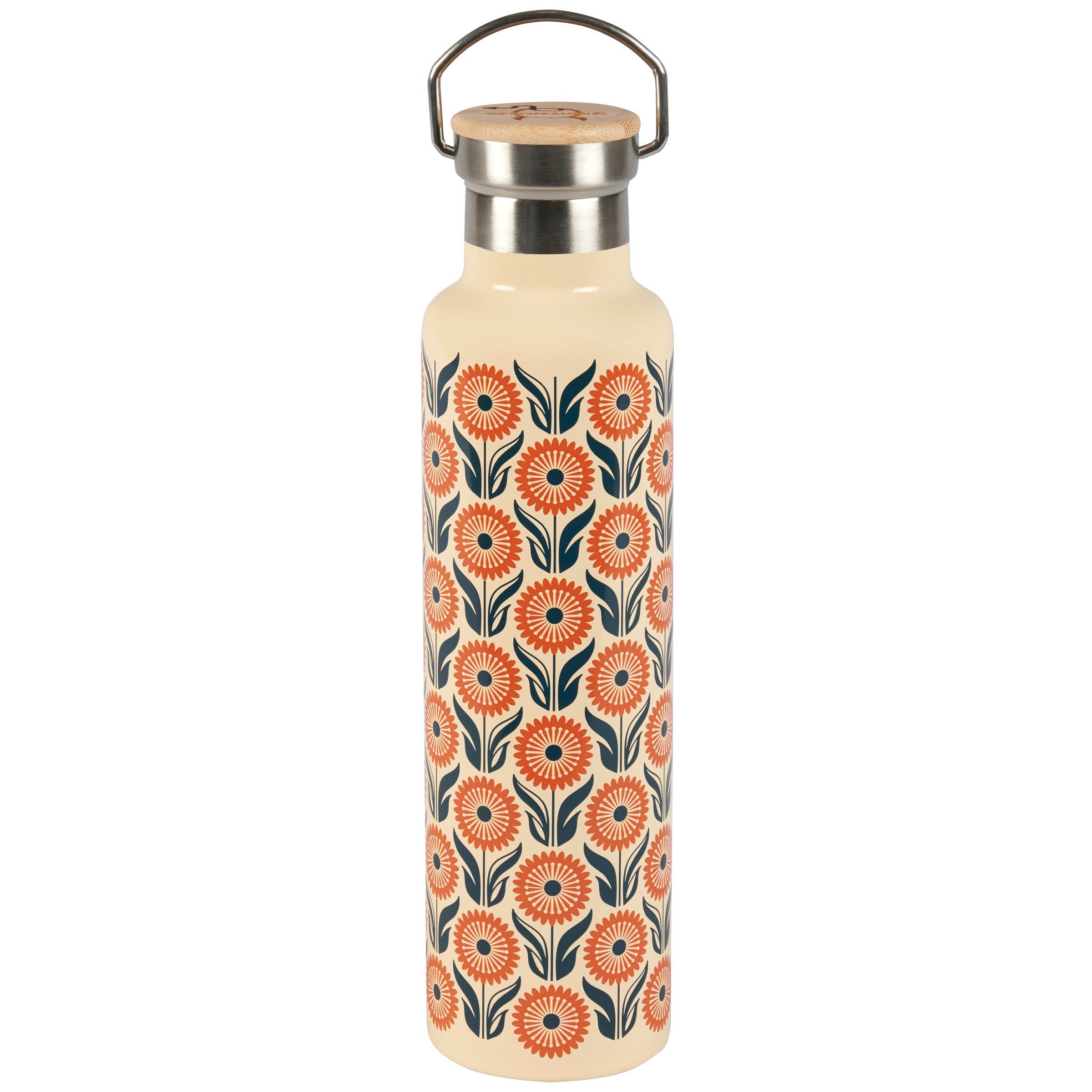 This insulated stainless steel water bottle displays a full wrap-around design of eye-catching florals in a bold color palette for a stylish everyday accessory. Questionables insulated bottles keep up to 25 oz beverages cold for 24 hours and hot for 12 hours and includes a coordinating lid with bamboo top. BPA free bottle is hand wash only; do not microwave. Our Hipster Daisies insulated bottle is an everyday accessory that demands the attention of others and is perfect for staying hydrated on-the-go or at home.
