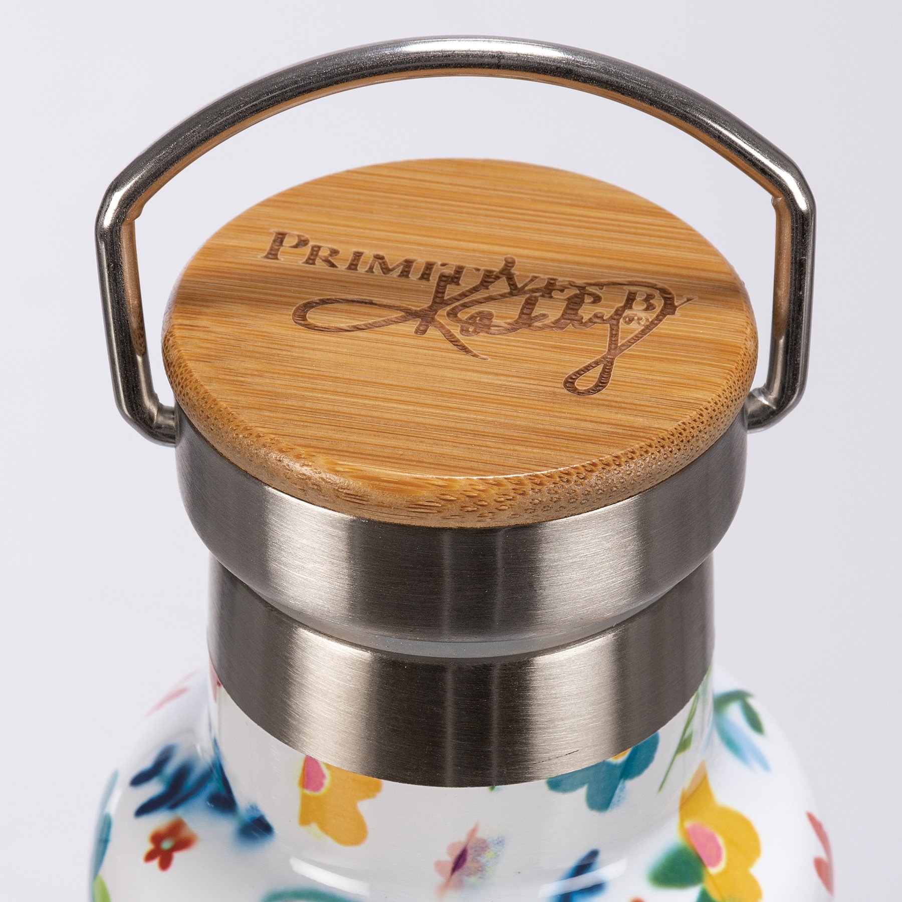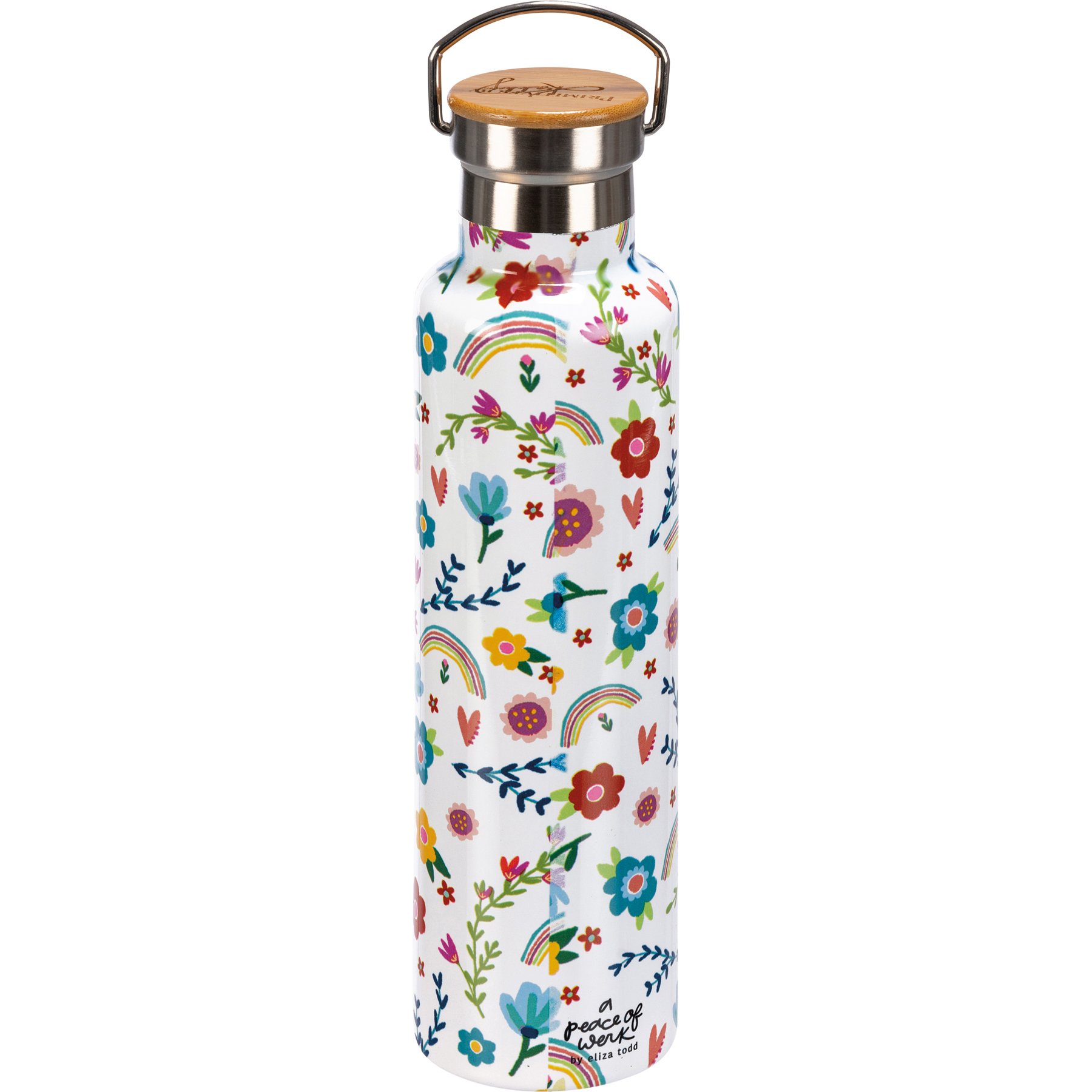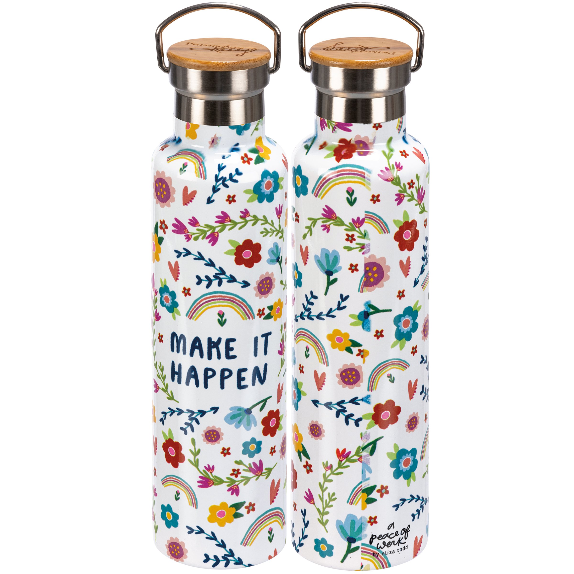 An insulated stainless steel bottle featuring a "Make It Happen" sentiment, vibrant and whimsical floral designs, and an engraved logo on the bamboo lid. Holds 25 ounces. Our Happen insulated bottle keeps beverages cold for 24 hours and hot for 12 hours. Hand-wash only. BPA free.