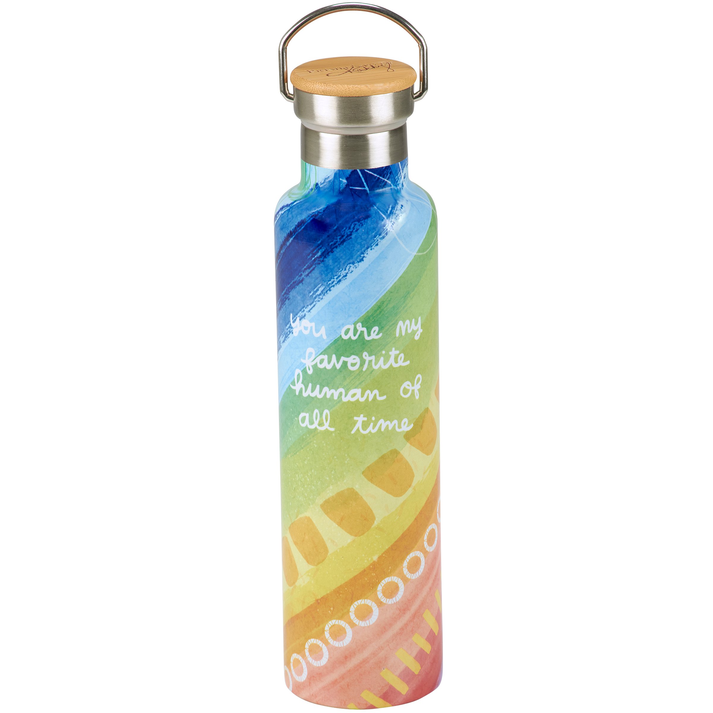 An insulated, double-walled stainless steel water bottle and coordinating lid with bamboo top layer. Featured in our Inspiration & Blooms Collection, our bottle displays a full wrap-around design of hand illustrated abstract art in a warm color palette with uplifting sentiment that reads "You Are My Favorite Human Of All Time." Our My Favorite insulated bottle keeps up to 25 oz beverages cold for 24 hours and hot for 12 hours. Hand-wash only; do not microwave. An inspirational everyday accessory perfect for on-the-go or at home.