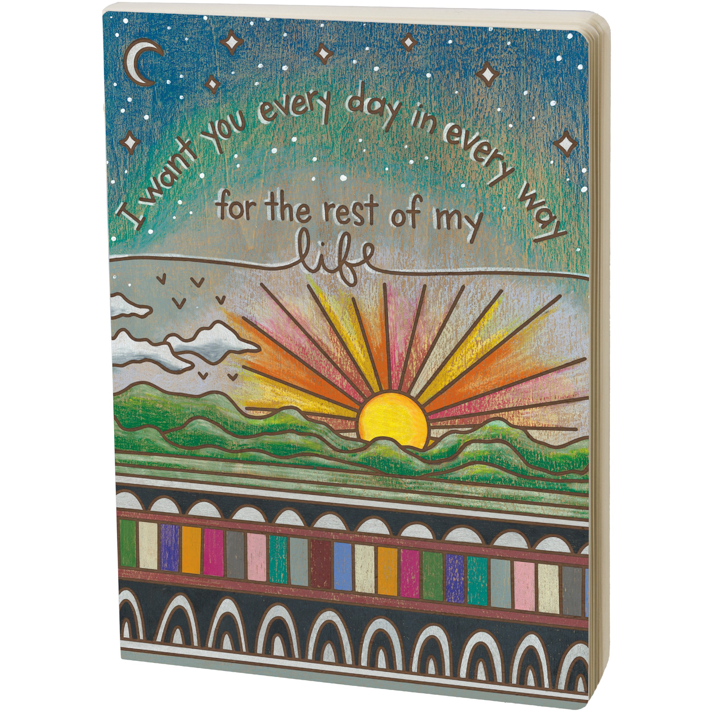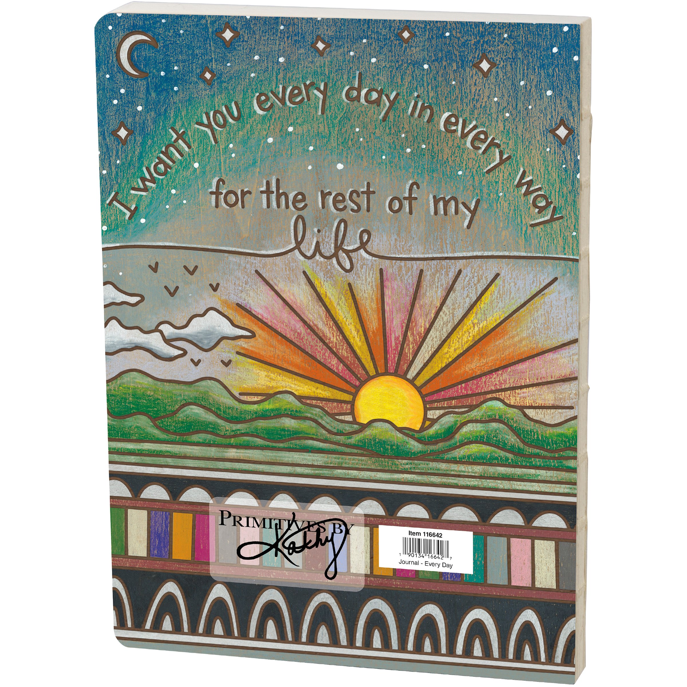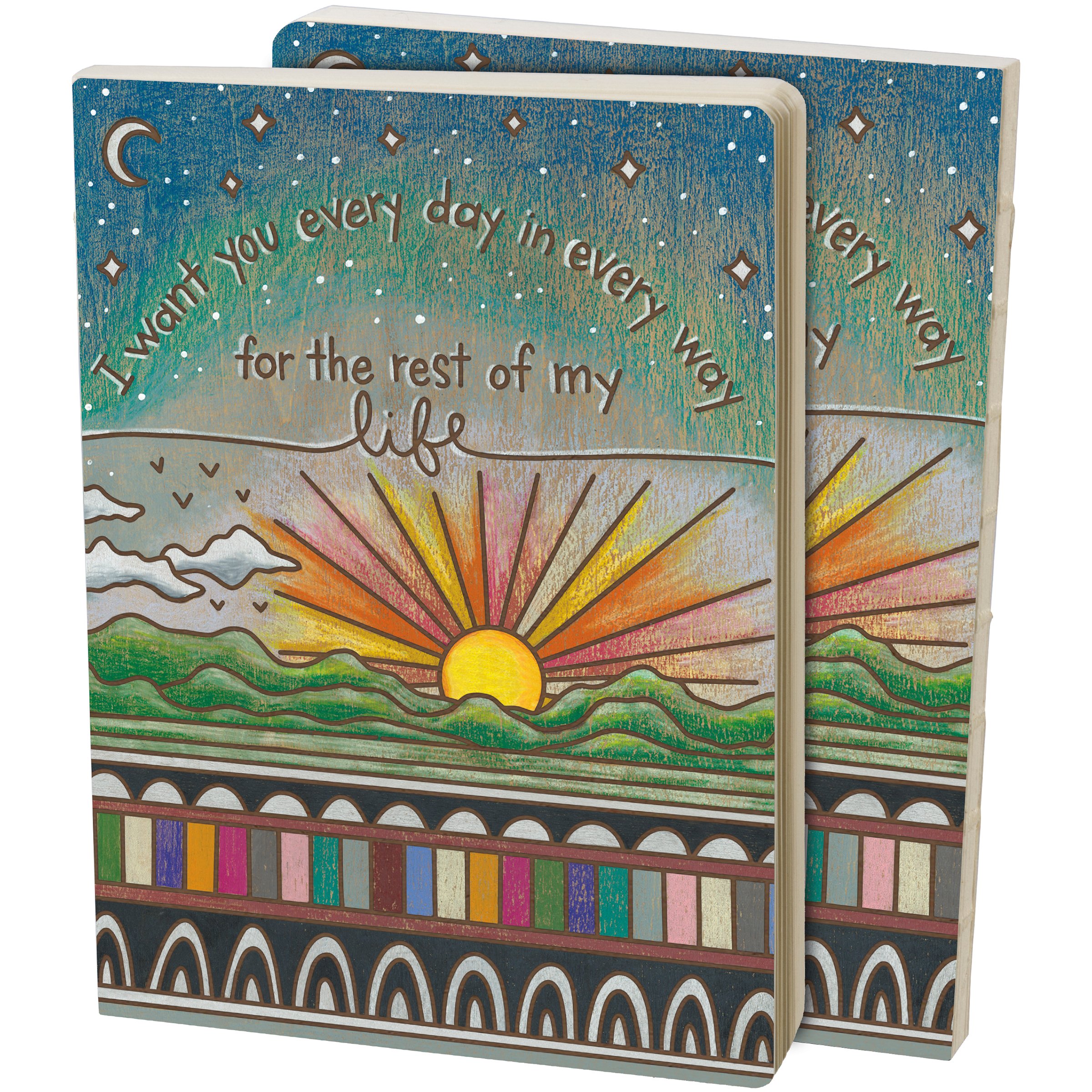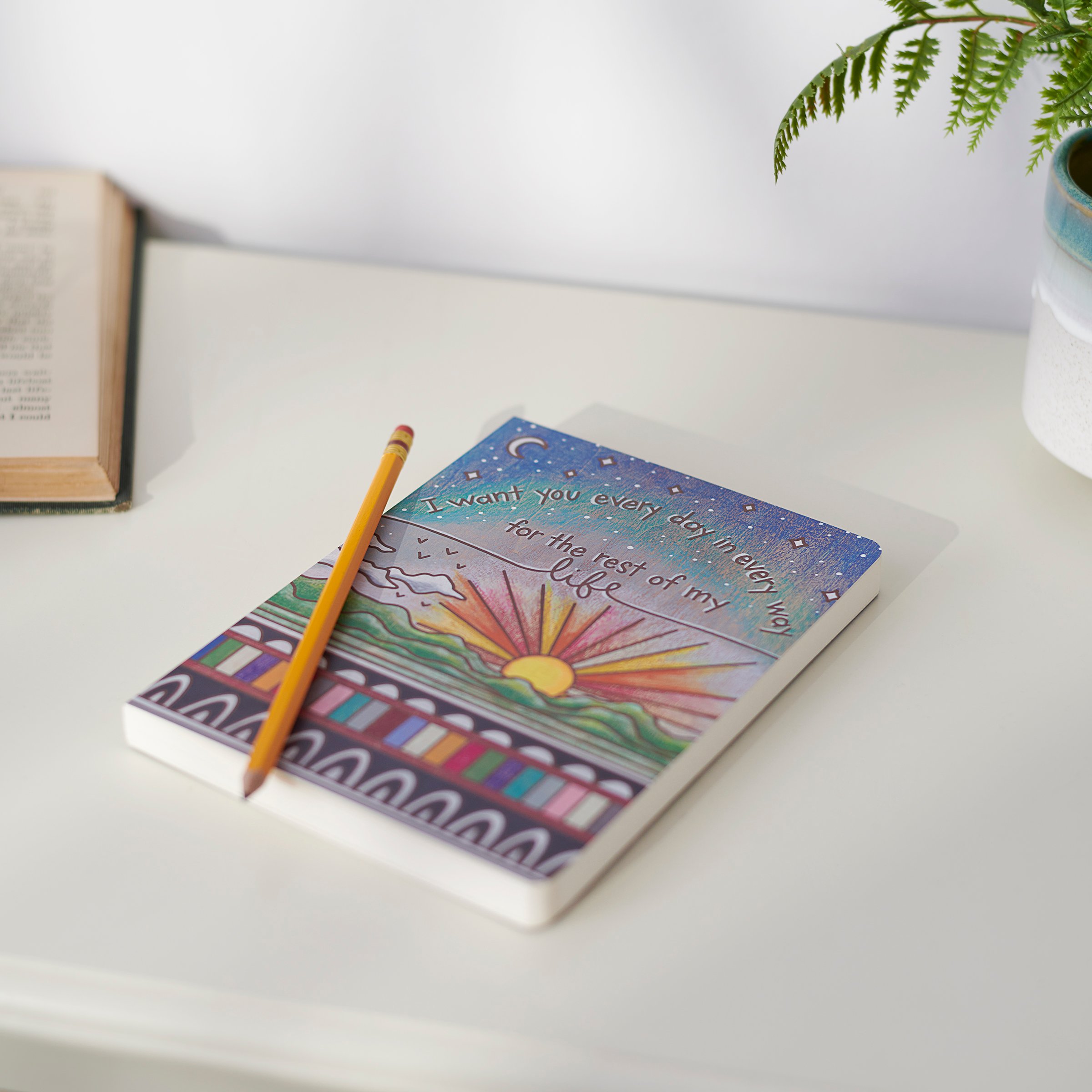 A double-sided journal from our Wood Burning Collection displaying a vibrant hand illustrated design of a horizon with sun, moon, and stars surrounding a heartwarming sentiment that reads "I Want You Every Day In Every Way For The Rest Of My Life." Design is replicated from original wood burned art. Our Every Day journal contains 160 lined pages and includes an open spine to lay flat for easy use. An inspirational gift perfect for an everyday accessory.