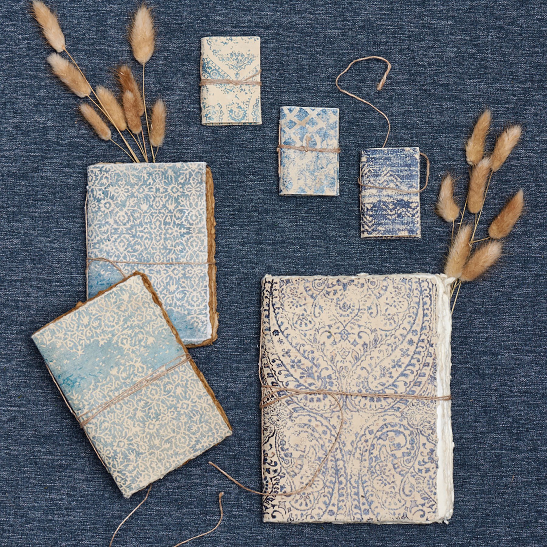 A decorative journal from our Indigo Collection displaying an indigo scroll design on a textured paper cover. Inside contains 96 unlined pages featuring deckled edges and an aged aesthetic to pen anything that is desired. Our Indigo Scroll journal includes wrap-around jute tie closure to keep secure. A decorative and functional everyday home accent perfect for any home office or desk.