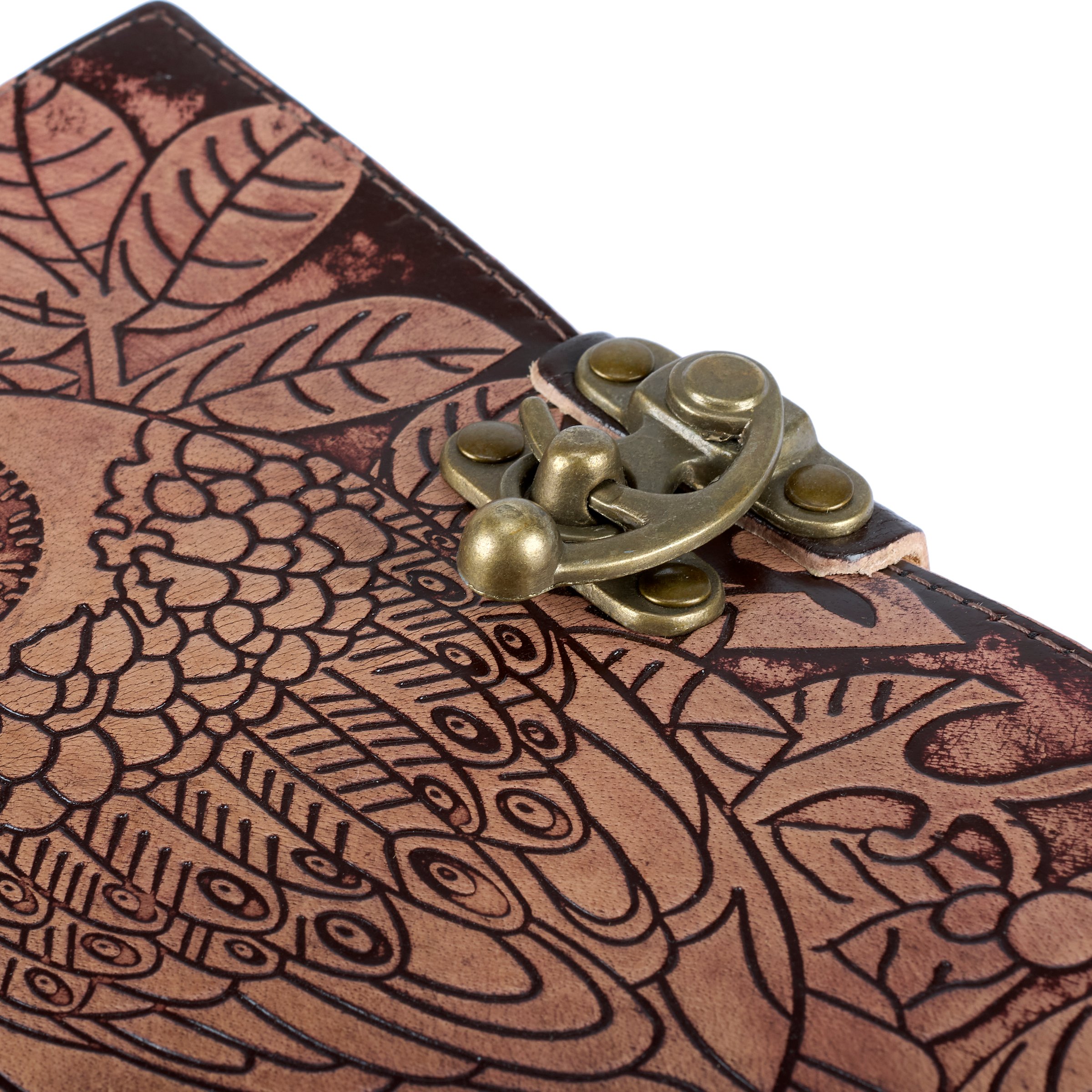 A decorative journal from our Dark Academia Collection displaying an embossed night owl design on a brown leather cover. Inside contains 200 unlined pages featuring deckled edges and an aged aesthetic to pen anything that is desired. Our Night Owl journal includes an antique metal clasp to keep secure. A vintage nature-themed accessory perfect for any home office or desk.