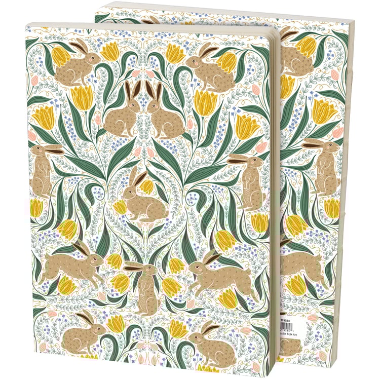 A double-sided journal from our Easter & Spring Collection displaying various charming rabbit designs complemented by spring flowers on the front and back. Designs are replicated from original hand illustrated artwork inspired by folk art. Our Rabbit Folk Art journal includes 160 lined pages and an open spine to lay flat for easy use. A stylish gift perfect for a seasonal accessory.