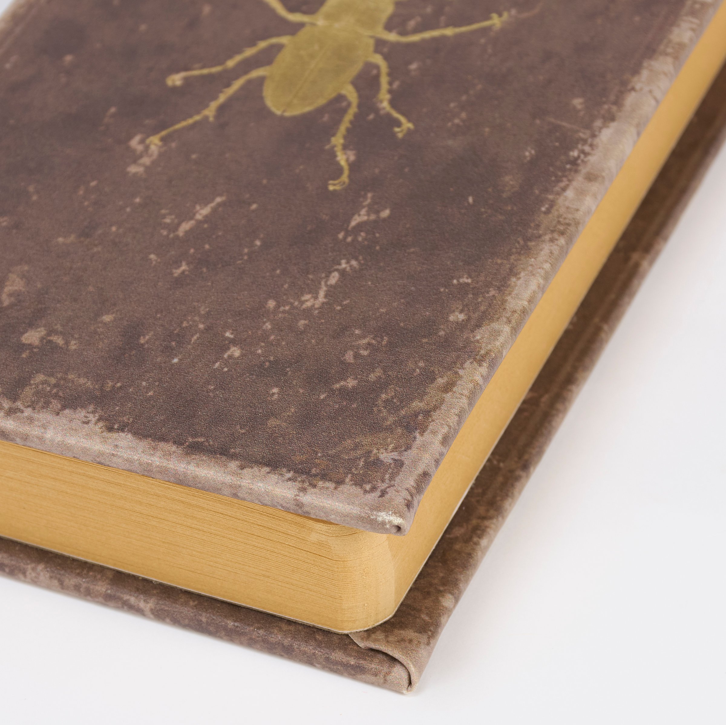 A high-quality decorative journal from our Dark Academia Collection displaying a vintage book inspired design. Vintage book design features a textured faux leather wrap with distressed details displaying a beetle on the front cover. Journal spine also displays a coordinating design with book title and author to give the appearance of a book when on a shelf. Our Vintage Beetle journal includes 170 lined pages on vintage style paper to complete the aged appearance. A vintage book-themed gift perfect for any home office or desk.