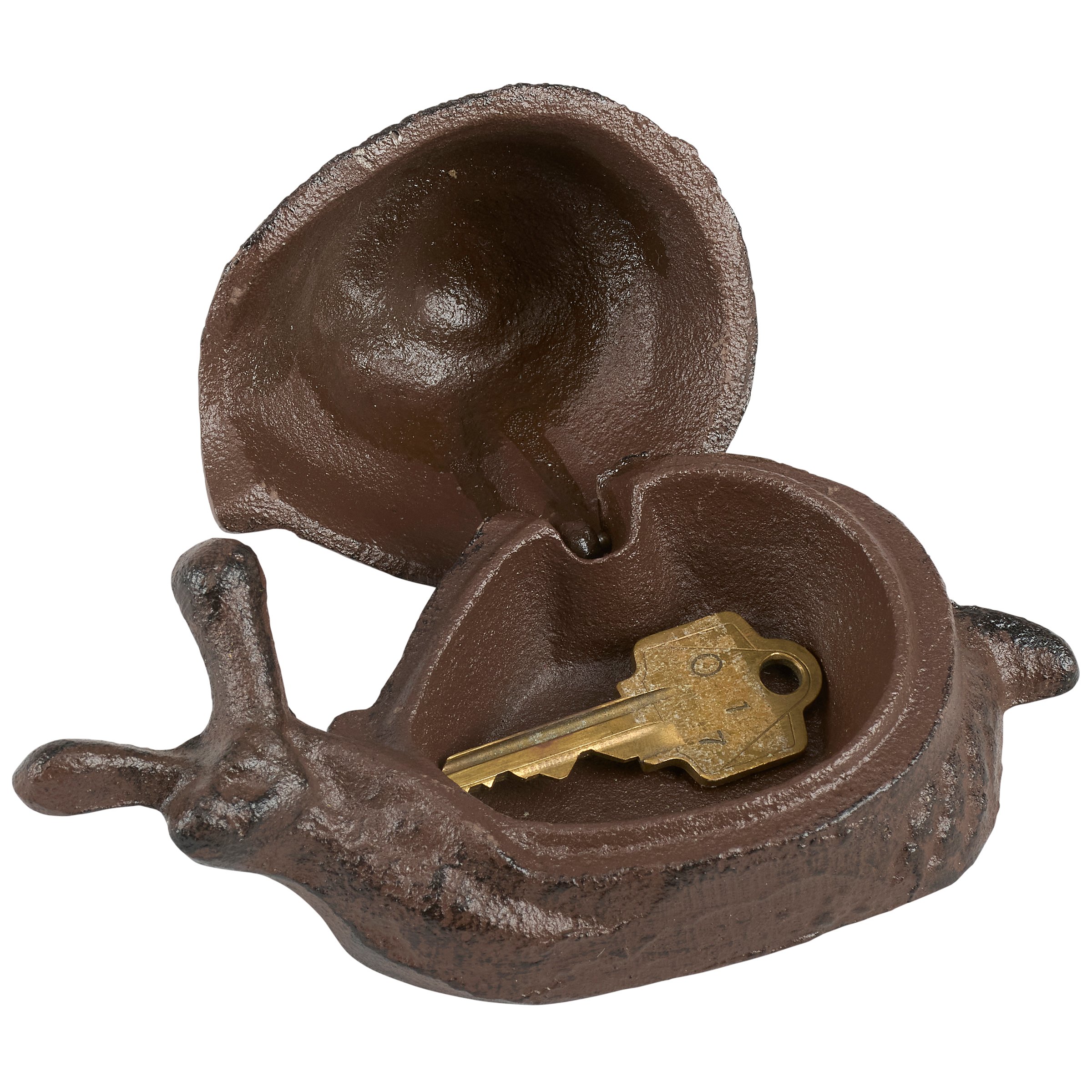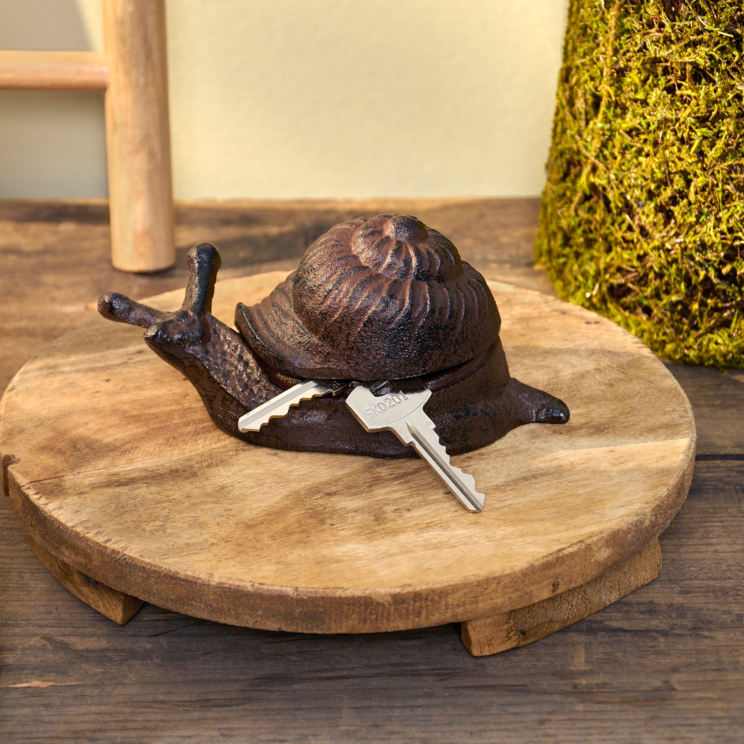 A metal key hider from ourĀ Garden Collection featuring a sculpted snail design with antique detailing and a hinged shell to open and store a key. Our Snail key hider easily blends into outdoor displays to subtly store a spare key while appearing as a garden accent that adds functional style to any garden or houseplant display.