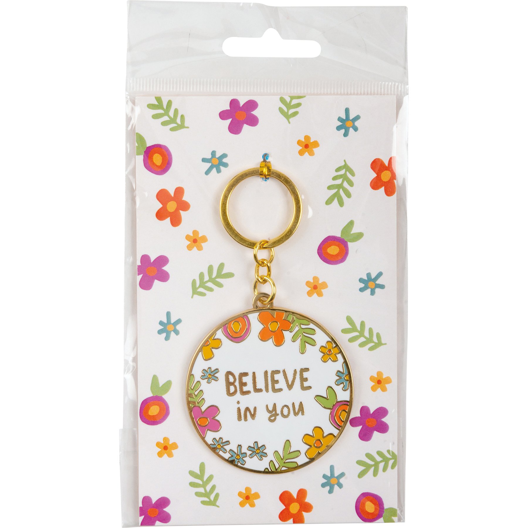 A high quality hard enamel keychain featuring floral designs with "Believe In You" sentiment. Keychain is attached to decorative backer card with floral designs on the front and "You Got This" sentiment on the back with space for a handwritten note. Our Believe In You keychain includes a lobster clasp to attach to backpacks, key rings, and more.