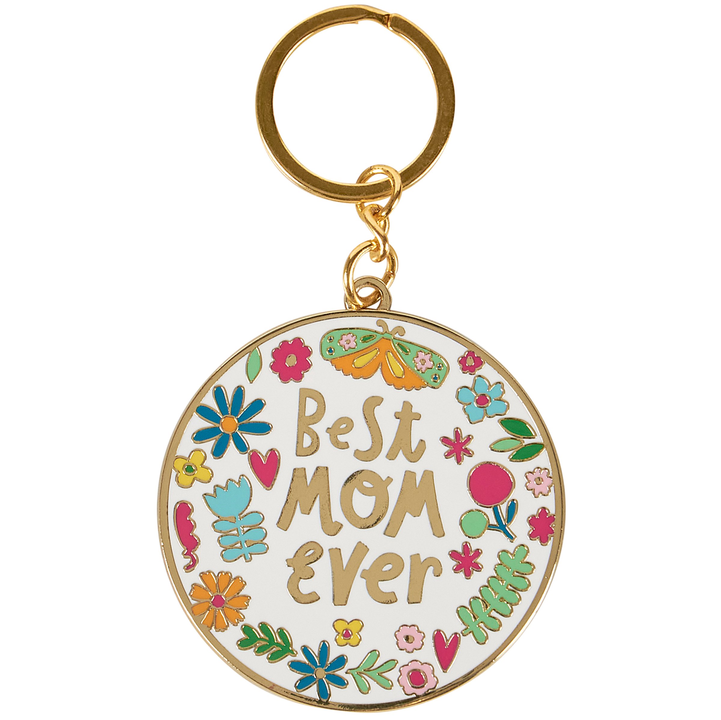 A high quality hard enamel keychain from our Mother's Day Collection featuring a butterfly, flowers, and hearts design with gold outlines and a "Best Mom Ever" sentiment in gold lettering. Enamel keychain includes a keyring to attach to zippers, organize keys, and more. Our Best Mom Ever keychain is attached to decorative backer card with floral designs on the front and "Best Mom Ever" sentiment on the back with space to make a handwritten note. Packaged in poly bag with keyhole at the top for easy rack display. A heart warming and functional everyday accessory perfect for gifting.
