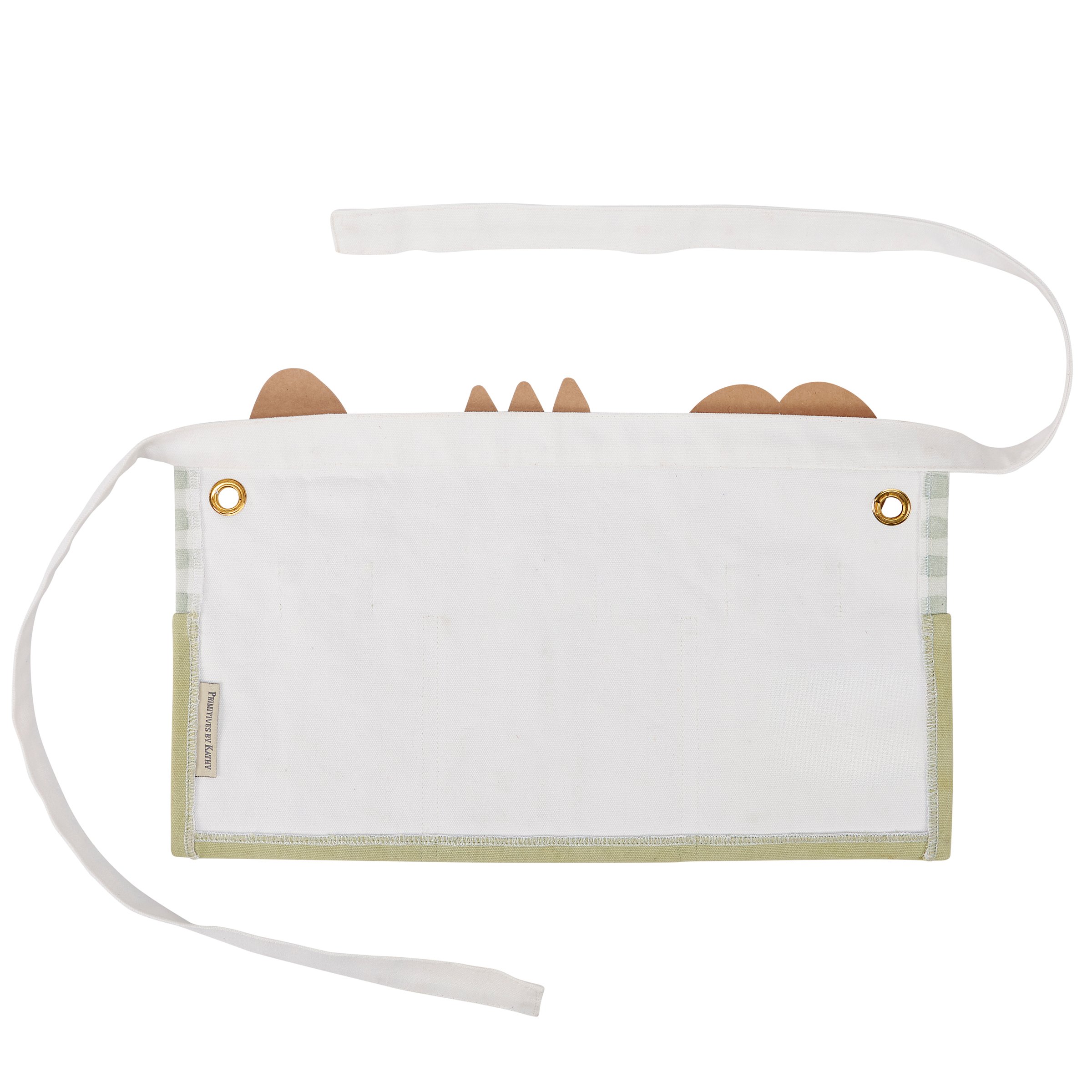 A thick canvas kids apron from our Garden Collection featuring a half apron style with spaces to hold tools and metal grommets on each side to hang accessories, making it perfect for kids to use while helping with gardening. Kids apron displays a green color on the pockets and coordinating green gingham pattern behind tool holders. Garden apron includes waist ties to create the perfect fit. Our Green Gingham kids apron is conveniently machine-washable for easy cleaning. Packaged with three cardboard cutouts displaying tool designs to show how garden apron can be used. Actual garden tools pictured not included. A charming garden-themed gift that creates special moments for parents and kids.