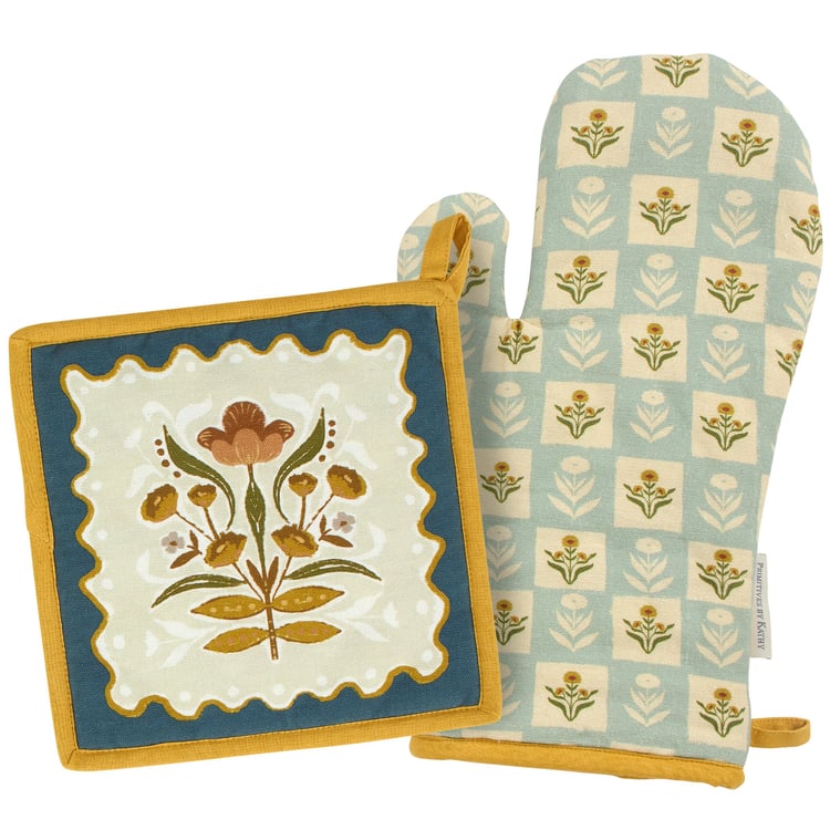 A kitchen set from our Fall & Harvest Collection including a hot pad and matching oven mitt featuring folk art inspired fall floral designs replicated from original art hand painted in a unique watercolor style. Hot pad design displays a fall floral design and oven mitt displays a pattern of the fall floral design with gold trim on both. Our Fall Folk Floral kitchen set is conveniently machine-washable for easy cleaning and includes a loop on each item for hanging. A folk art fall gift perfect for a seasonal kitchen accessory.