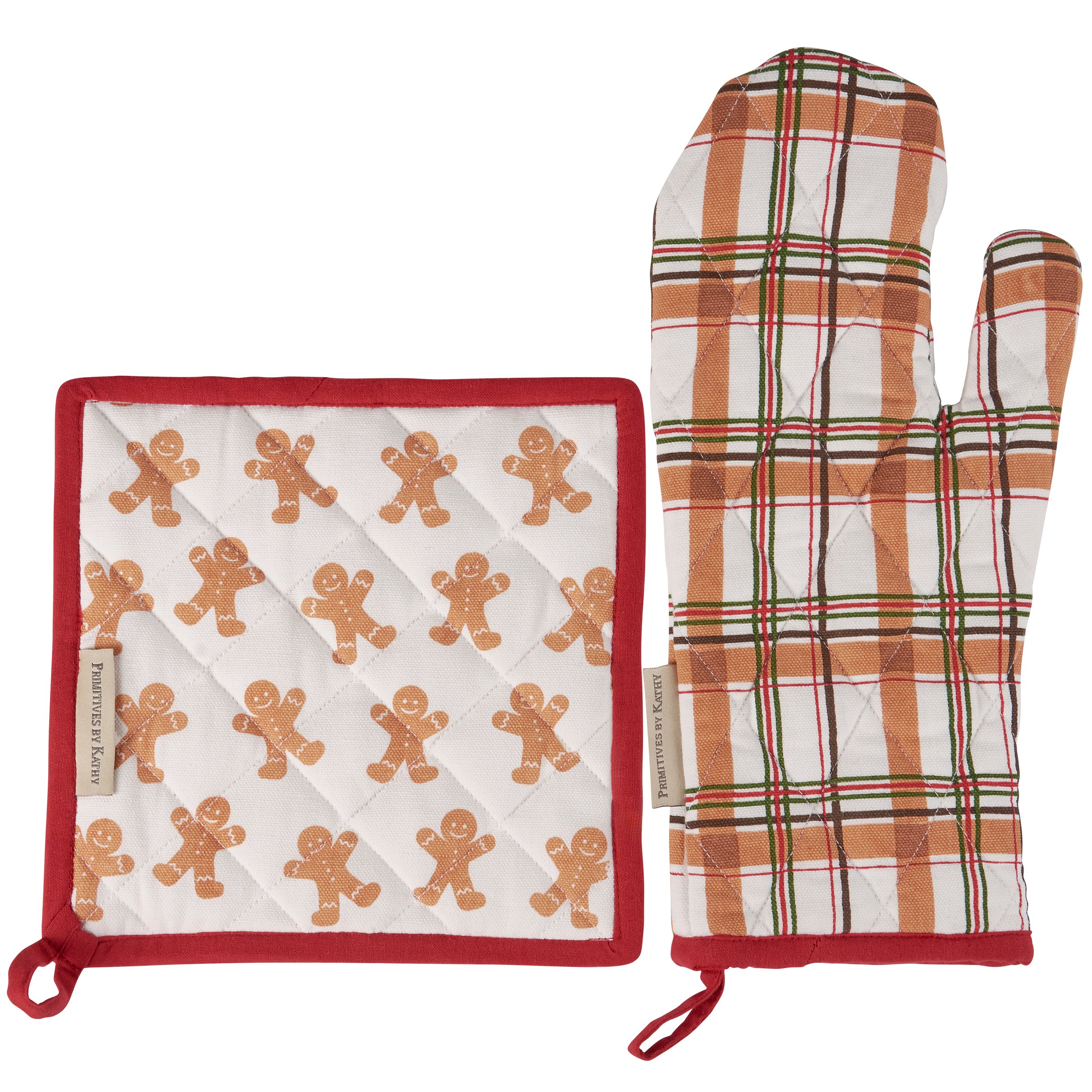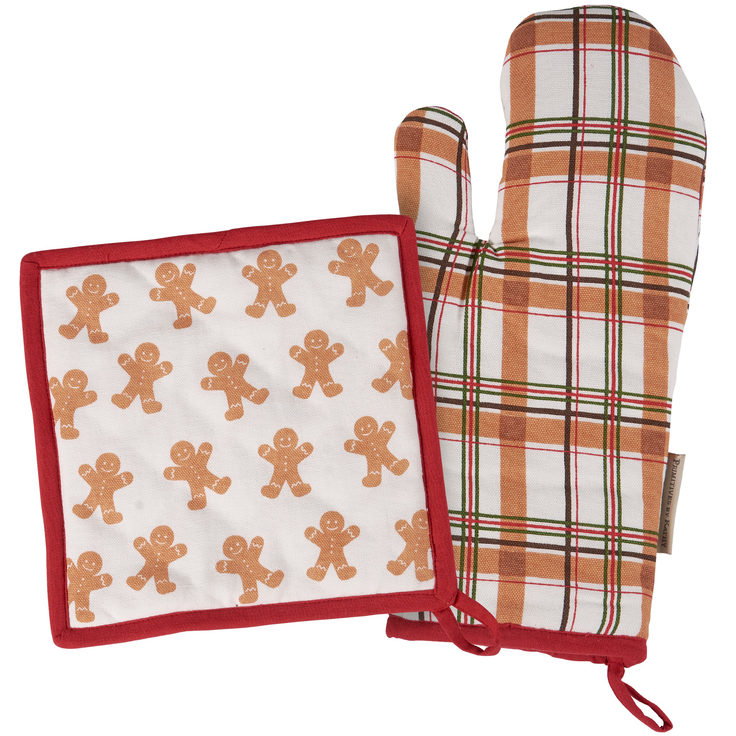 A kitchen set from our Christmas Collection including an oven mitt and matching potholder displaying gingerbread inspired plaid on the oven mitt and a fun gingerbread man pattern on the potholder with holiday red trim on each. Our Gingerbread Man kitchen set is conveniently machine-washable for easy cleaning and includes a loop on each item to hang. A fun gingerbread-themed gift set perfect for a seasonal kitchen accessory.