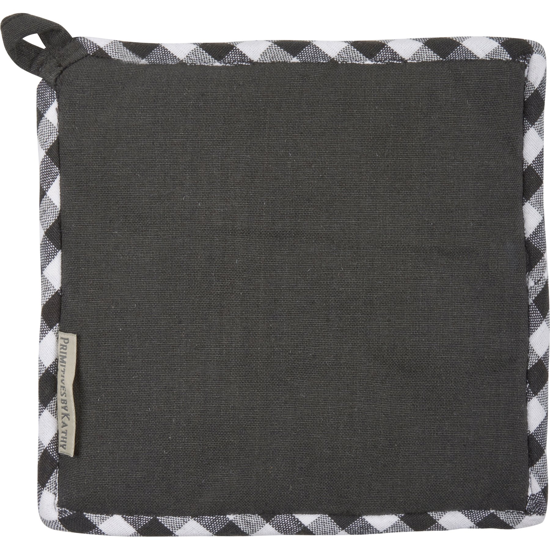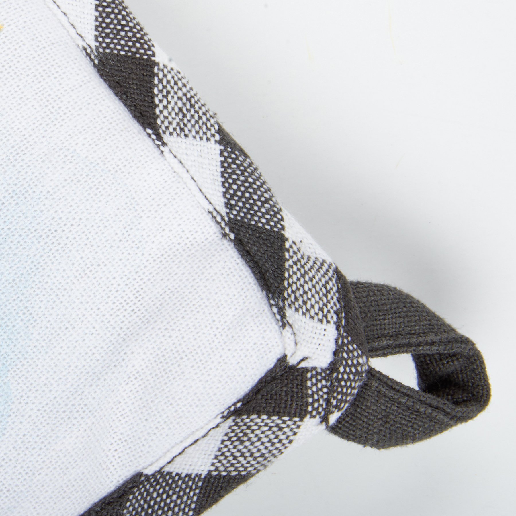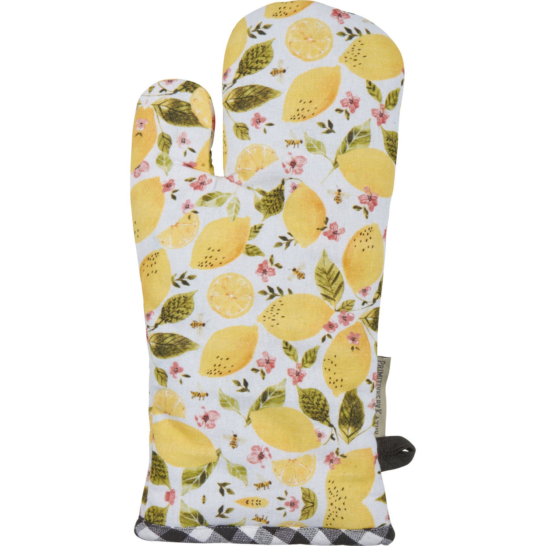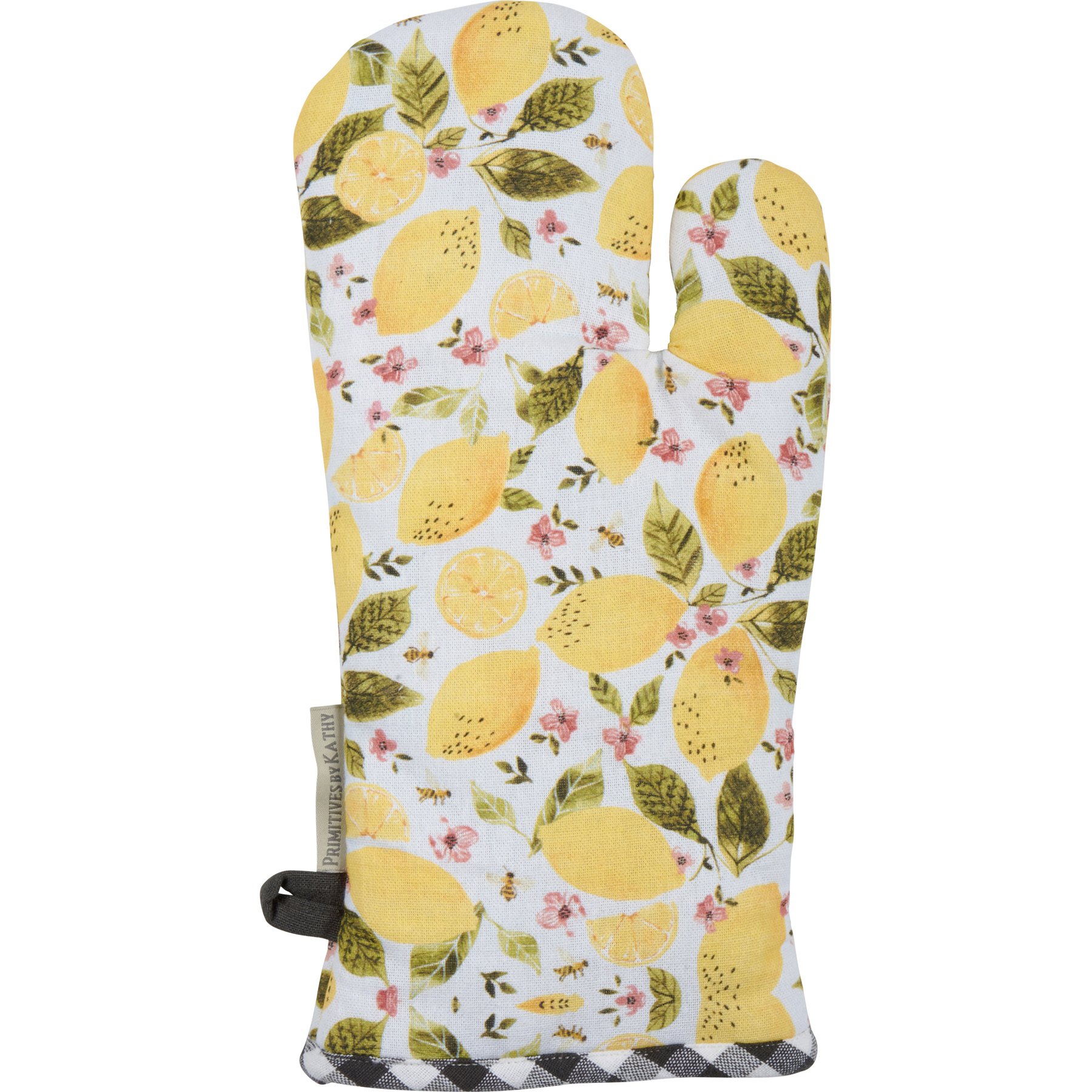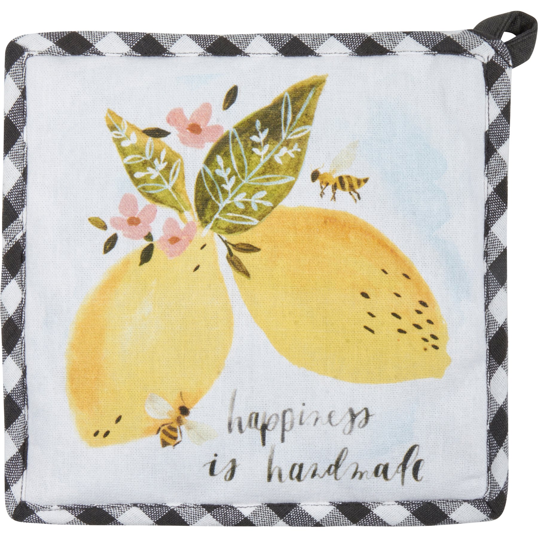 A kitchen set from our Garden Collection including a potholder and matching oven mitt displaying watercolor designs of lemons, flowers, and bees. Potholder design features hand illustrated "Happiness Is Handmade" sentiment and oven mitt features all-over print with black and white gingham pattern trim on both. Our Happiness Is Handmade kitchen set is machine-washable and includes loop on each item for hanging.
