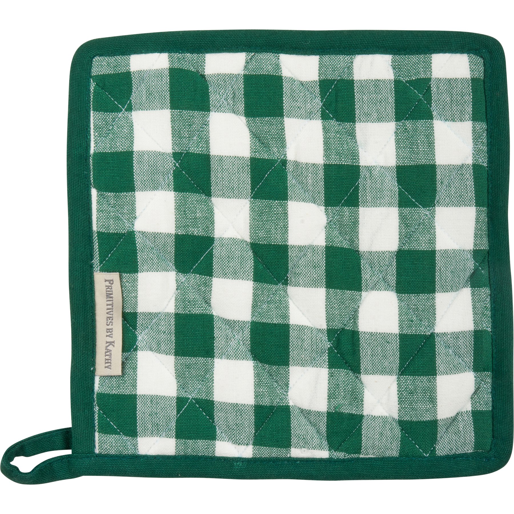 A kitchen set from our Farmhouse Collection including a potholder and matching oven mitt displaying vintage art of two ducks with coordinating punny sentiments. Potholder design features embroidered "I Don't Give A Duck" sentiment and oven mitt features "Don't Duck With The Chef" with dark green trim on both. Our I Don't Give A Duck kitchen set is machine-washable and includes a loop on each item for hanging. A fun and functional everyday kitchen accessory perfect for a rustic style.