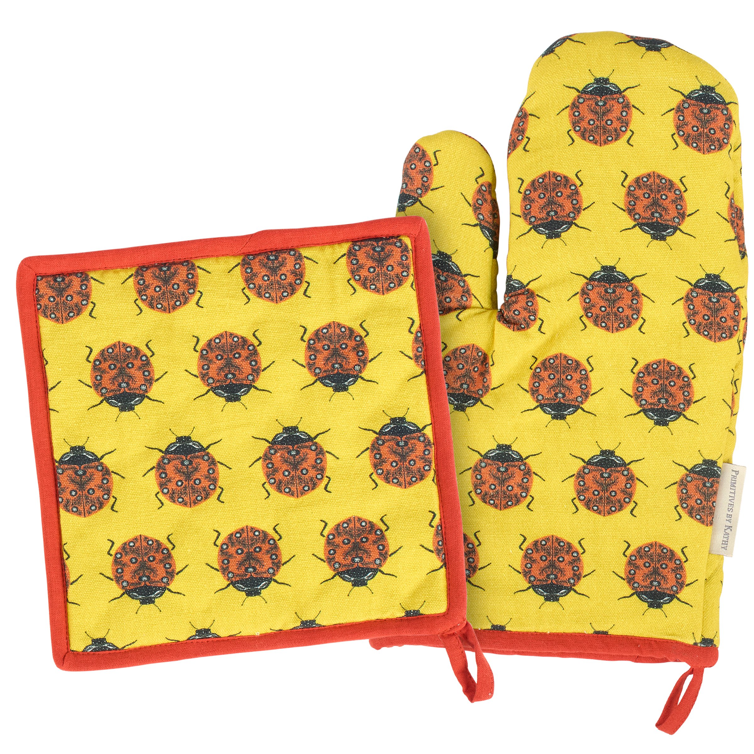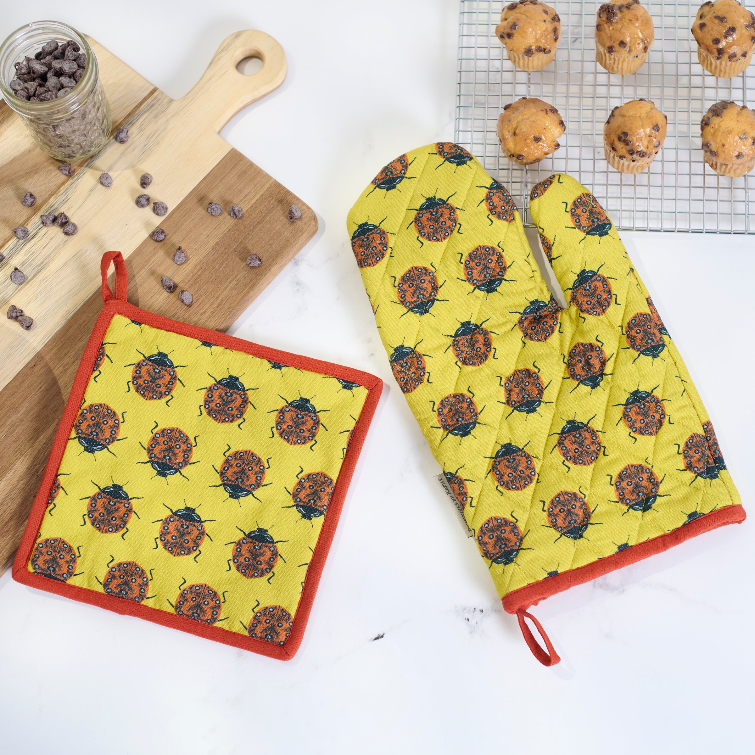 A kitchen set from our Garden Collection including a garden bug inspired oven mitt and matching hot pad displaying double-sided designs replicated from original hand illustrated art. Garden-themed oven mitt and hot pad displays a pattern of ladybugs with intricate details throughout as well as a coordinating red trim on each. Our Ladybugs kitchen set is conveniently machine-washable for easy cleaning and includes a loop on each item for hanging. A stylish ladybug-themed gift set perfect for an everyday kitchen accessory.