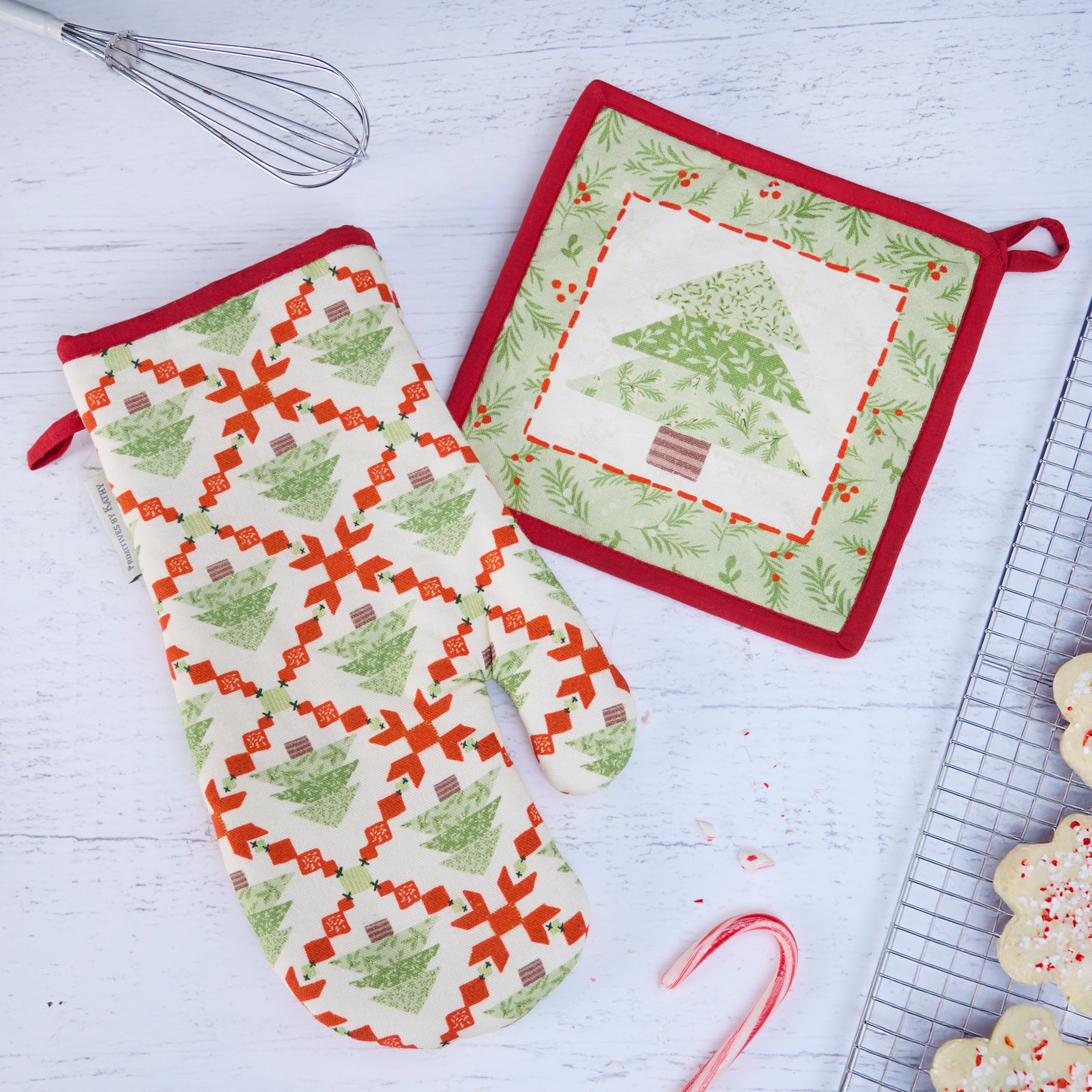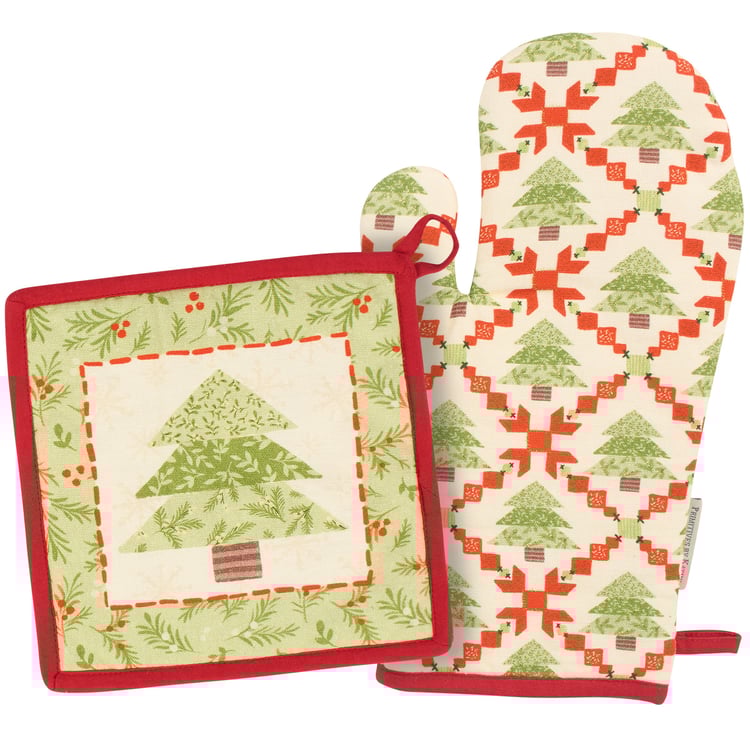 A kitchen set from our Christmas Collection including a hot pad and matching oven mitt featuring craft inspired Christmas quilt designs replicated from original art hand painted in a unique watercolor style. Hot pad design displays a tree quilt patch design and oven mitt displays a pattern of tree quilt patches with red trim on both. Our Tree Quilt kitchen set is conveniently machine-washable for easy cleaning and includes a loop on each item for hanging. A craft themed Christmas gift perfect for a seasonal kitchen accessory.