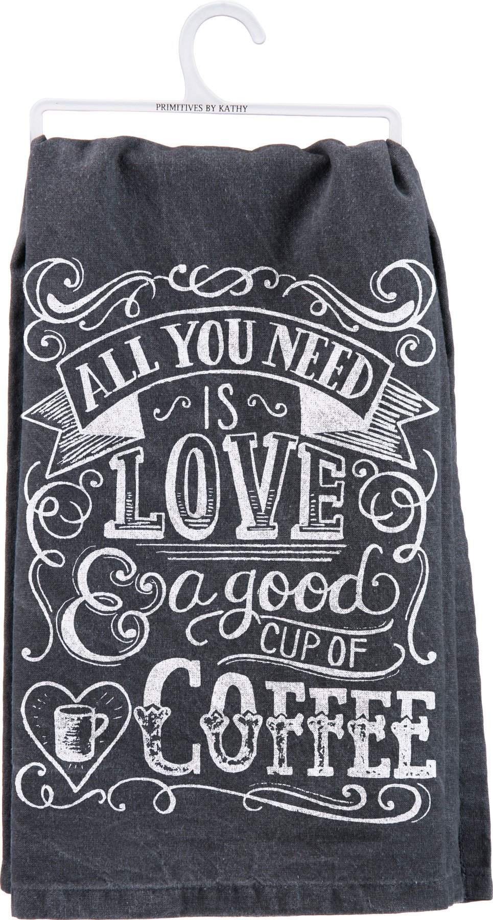 A black and white cotton kitchen towel featuring unique chalk art, hand lettered "All You Need Is Love & A Good Cup Of Coffee" sentiment, and mug, heart, and swirled line designs. Complements well with existing decor or coordinating design pieces. Machine-washable.