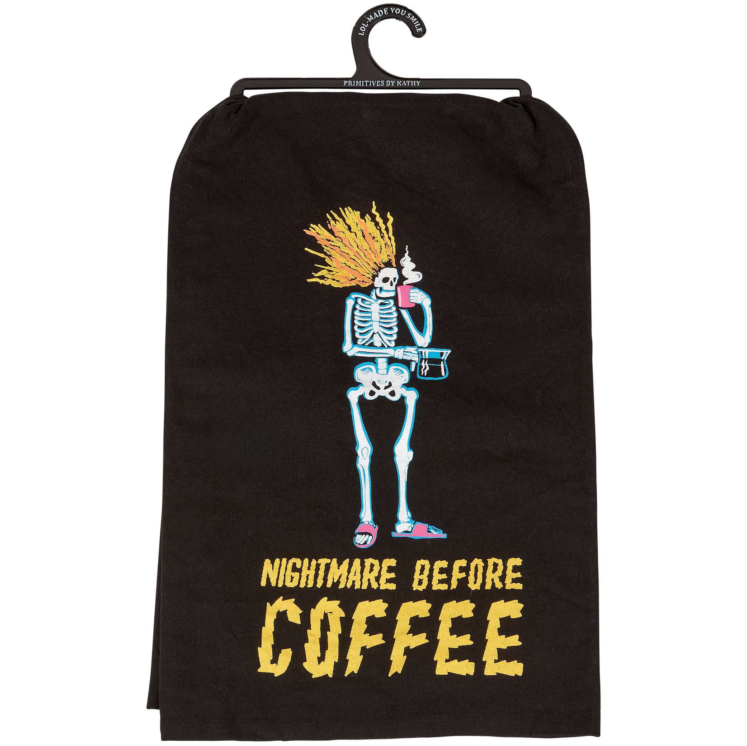 A black cotton kitchen towel from our Halloween Collection displaying a unique hand illustrated design of a skeleton drinking coffee with a fun Halloween inspired sentiment that reads "Nightmare Before Coffee." Design and sentiment are replicated from original hand illustrated artwork in a fun neon color palette that also looks great in blacklight. Our Before Coffee kitchen towel is conveniently machine-washable for easy cleaning. Seasonal kitchen towel is packaged on a black plastic hanger to easily display on rack. A fun Halloween-themed kitchen accessory perfect for seasonal use.