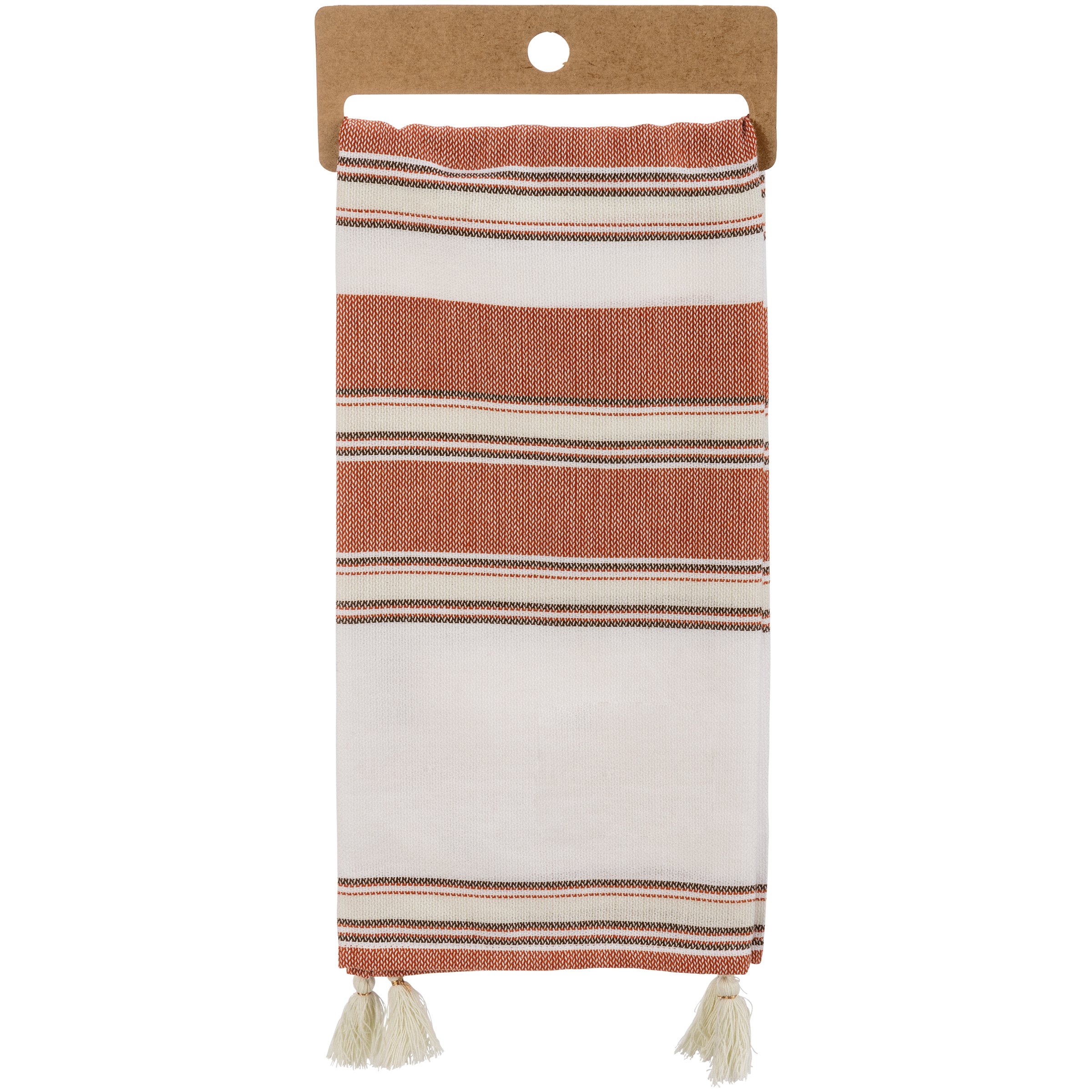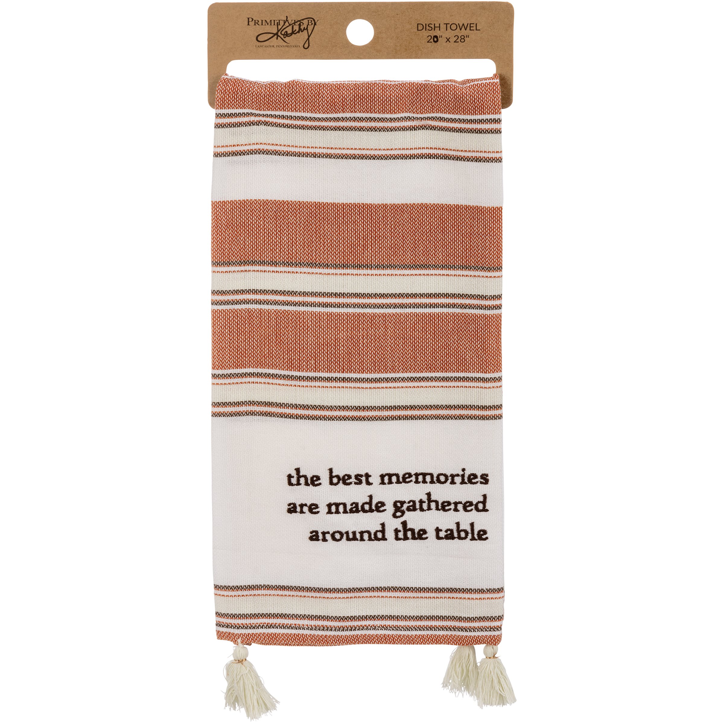 A cotton kitchen towel from our Fall & Harvest Collection features a fall-inspired color palette with embroidered "The Best Memories Are Made Gathered Around The Table" sentiment and woven stripe designs. Includes tassel accents for added interest. Towel is packaged on a cardboard hanger to easily display on rack. Our The Best Memories Are Made Gathered Around The Table kitchen towel is machine-washable.