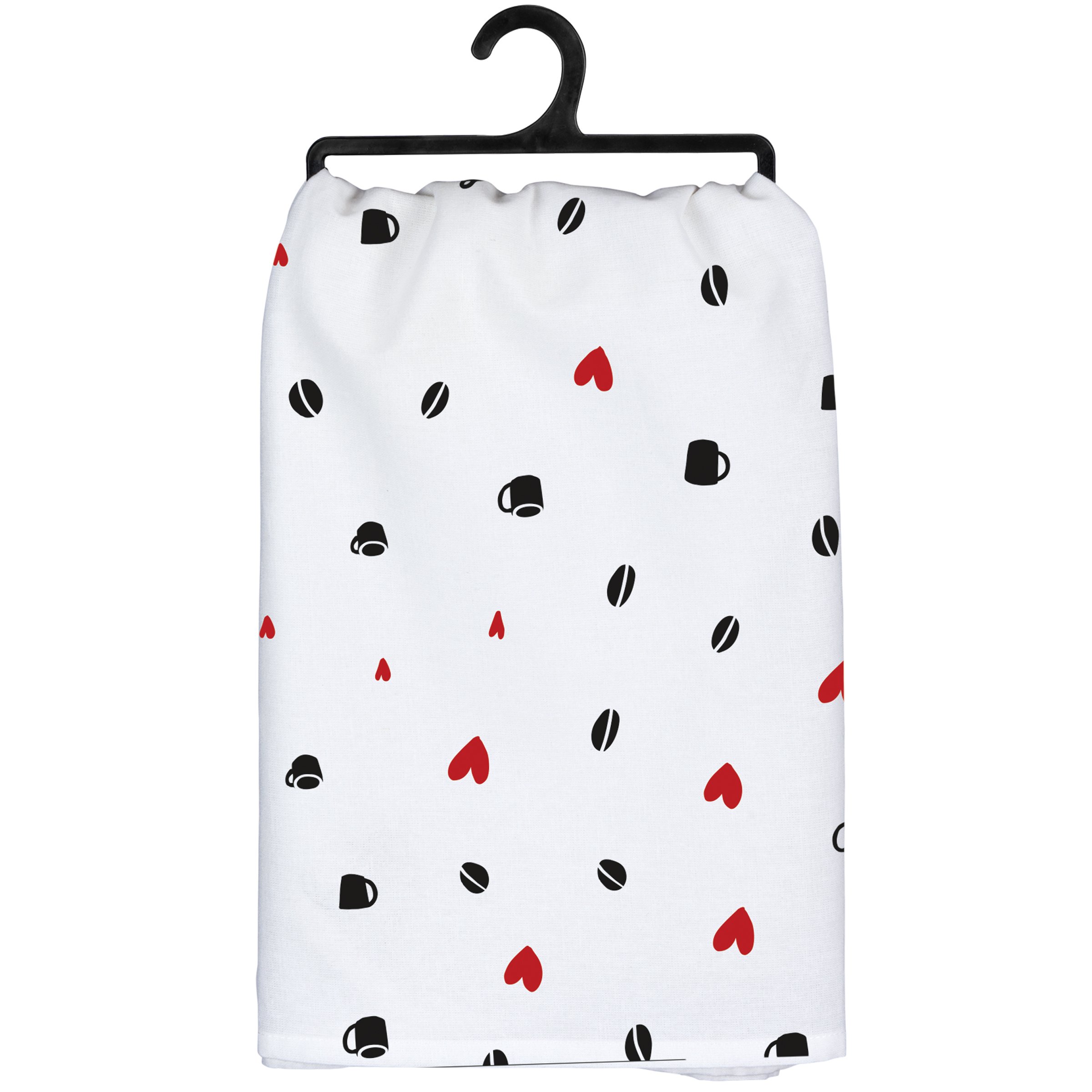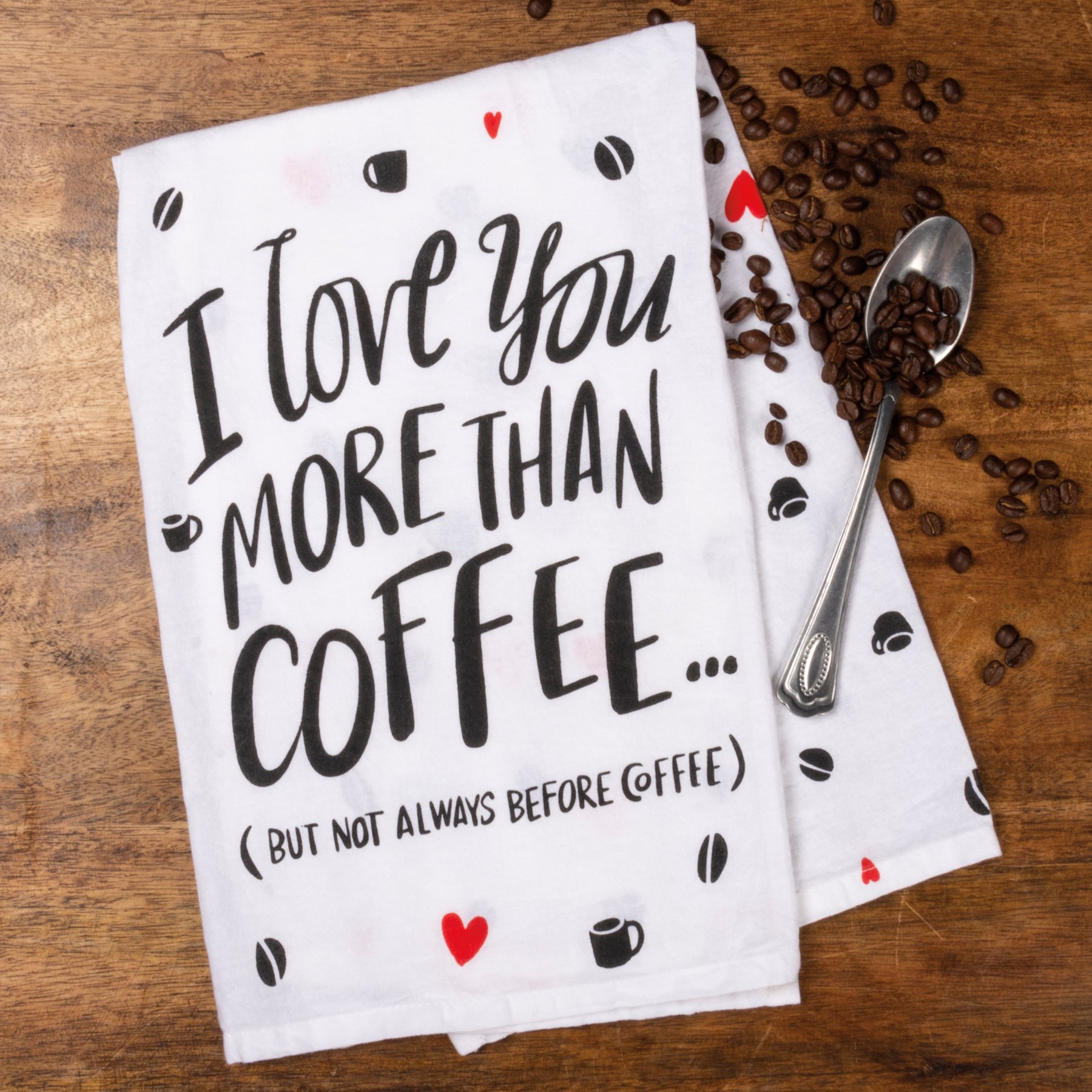 A cotton kitchen towel lending an "I Love You More Than Coffee (But Not Always Before Coffee) sentiment with heart, bean, and mug designs throughout. Machine-washable.