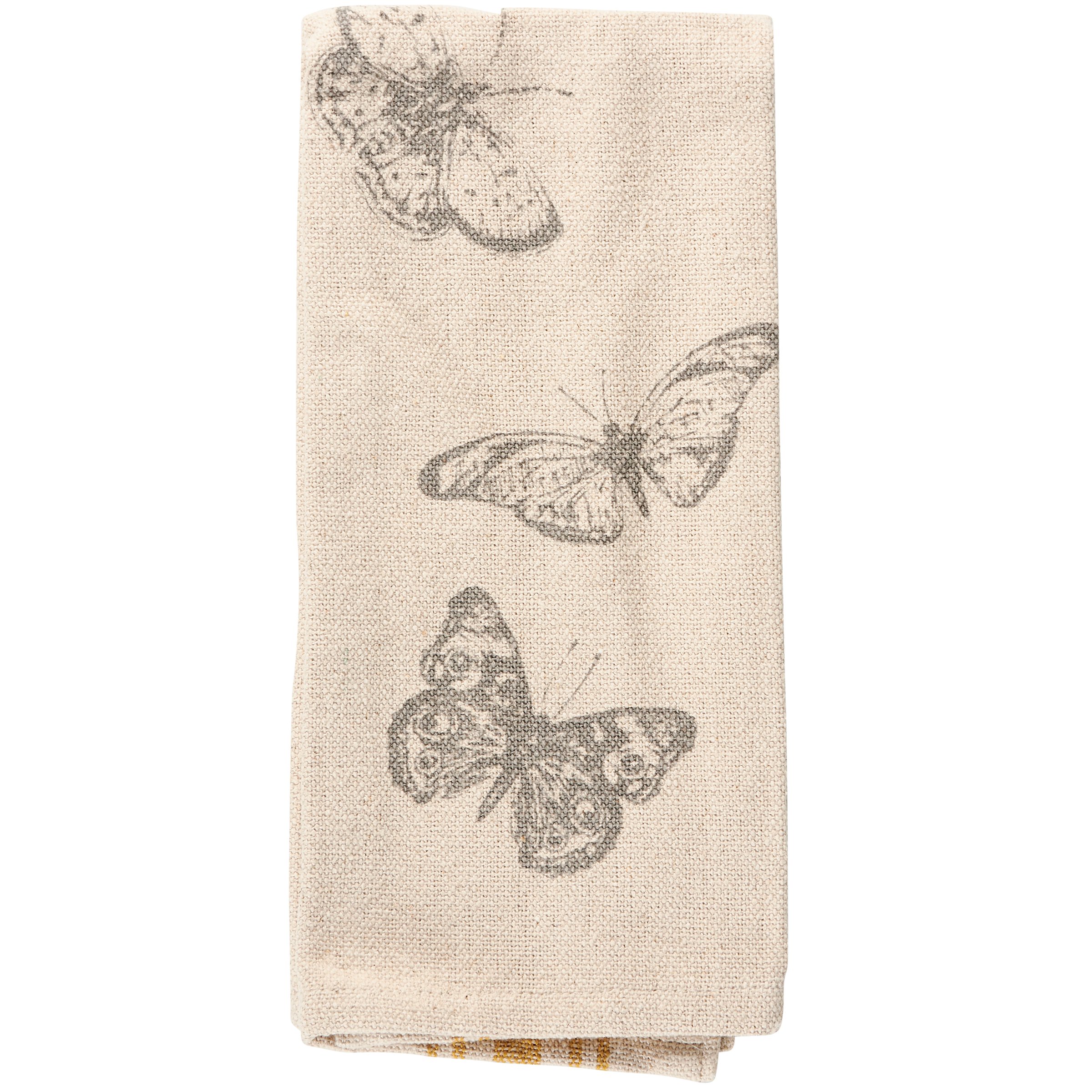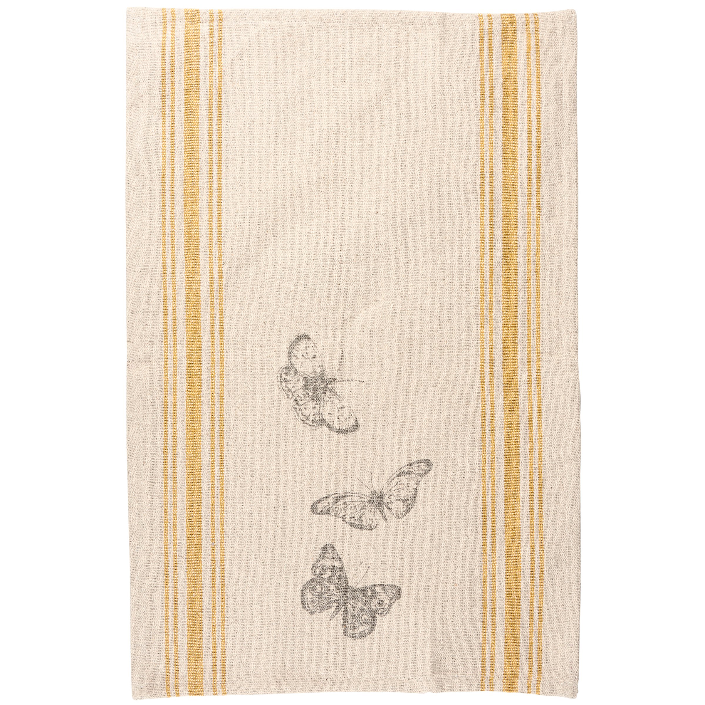 A cotton kitchen towel from our Easter & Spring Collection displaying a vintage style design of butterflies with gold stripes woven along each side. Towel includes cotton tape loop in corner for hanging. Our Butterfly kitchen towel is machine-washable for convenient cleaning. A charming spring-themed kitchen accessory perfect for everyday use.