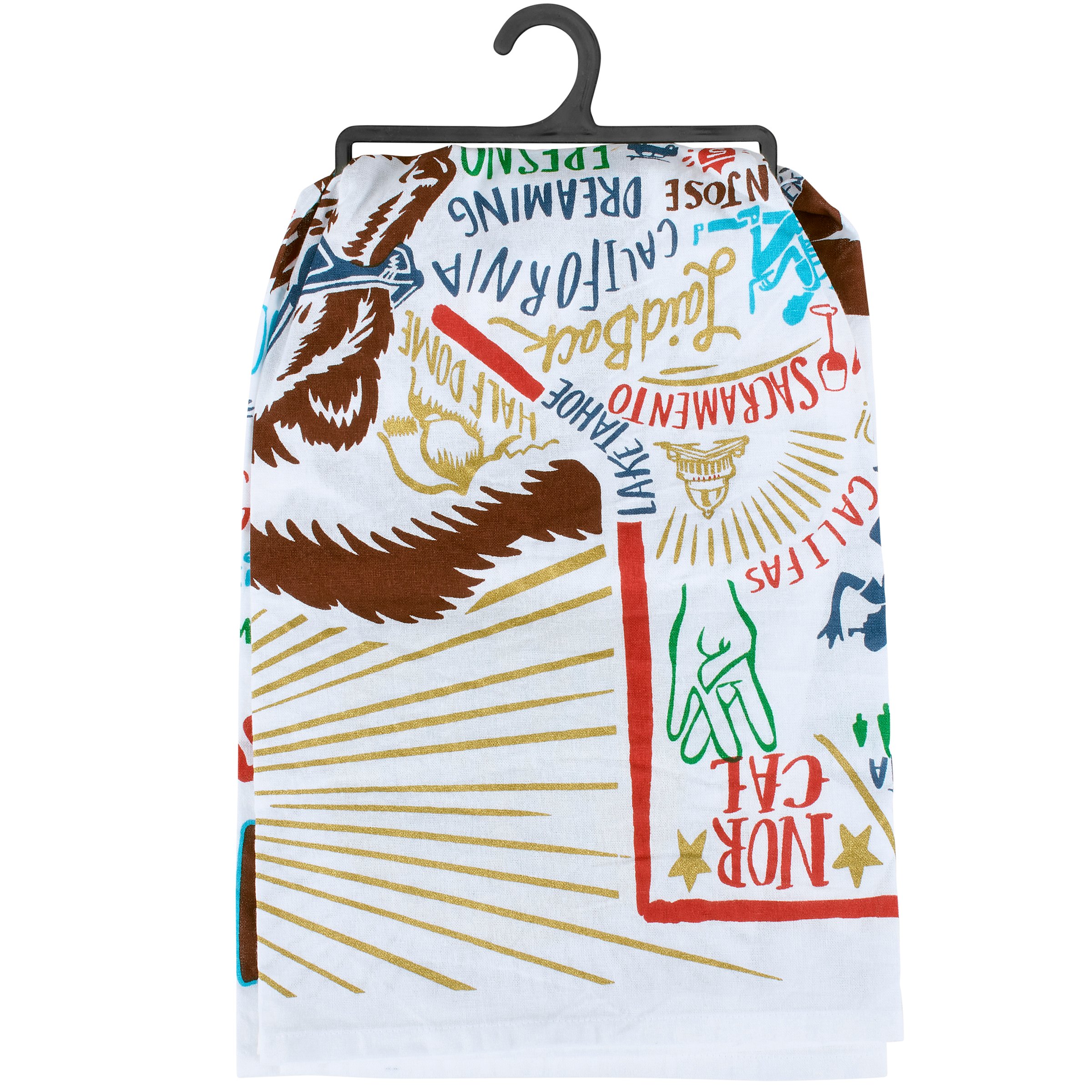 A fully-printed and vibrant California-themed cotton kitchen towel lending a state outline, flag-inspired background, and various illustrations and sentiments associated with the state throughout. Machine-washable.