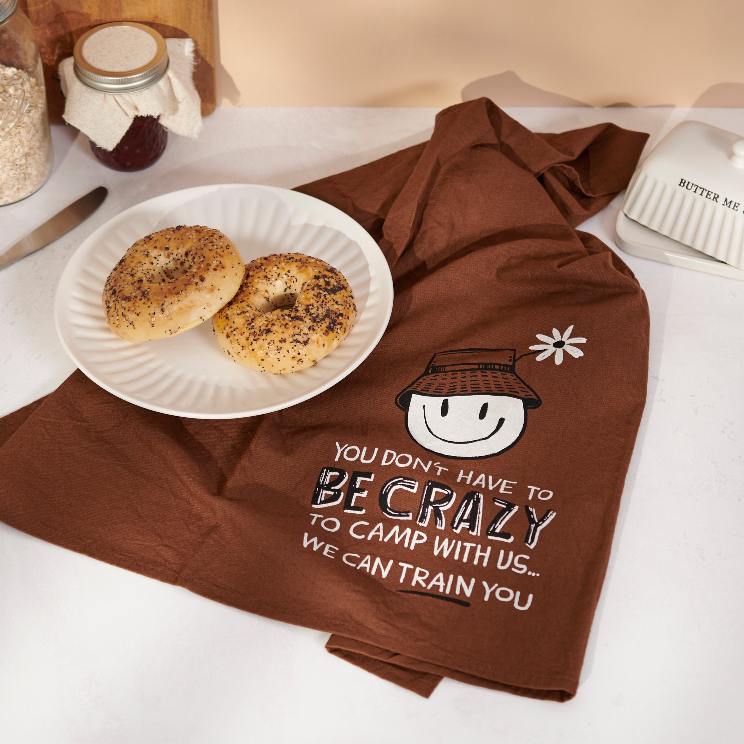 A brown cotton kitchen towel from our Lake & Cabin Collection displaying a unique hand illustrated design of a happy face in an outdoor hat above a humorous camping-themed sentiment that reads "You Don't Have To Be Crazy To Camp With Us... We Can Train You." Our Camp With Us kitchen towel is machine-washable for convenient cleaning. Packaged on a clear plastic hanger to easily display on rack. A fun camping-themed kitchen accessory perfect for everyday use.