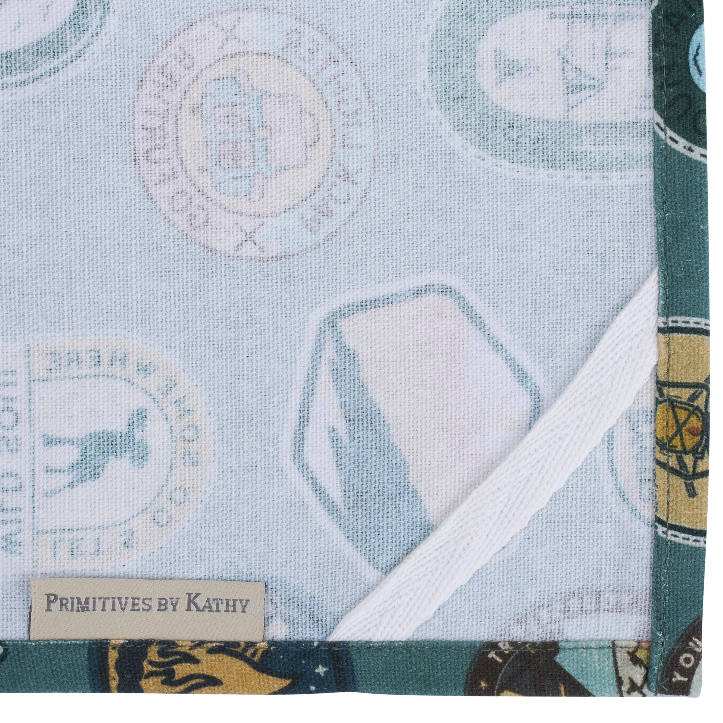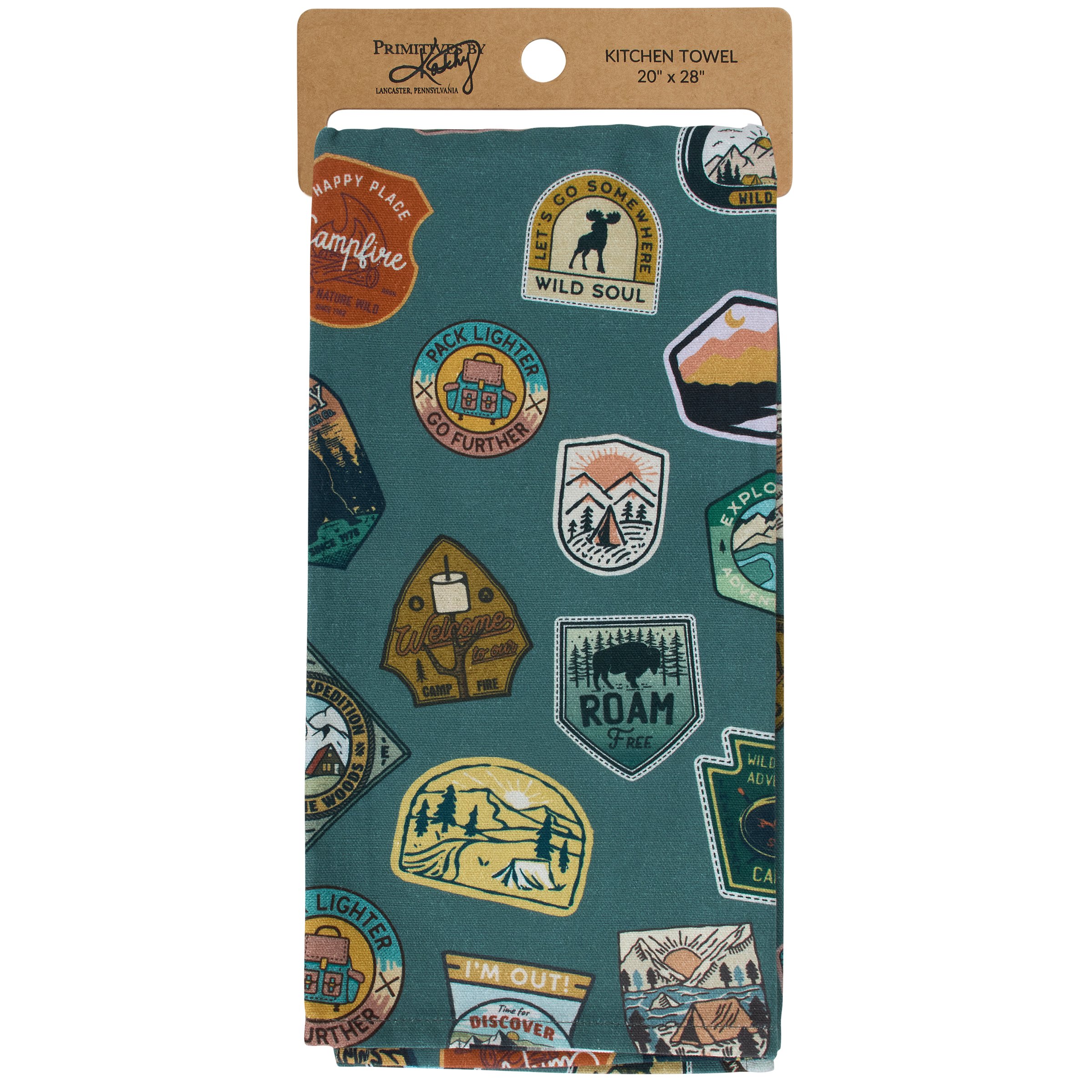 A green cotton kitchen towel from our Lake & Cabin Collection featuring an all-over design displaying a pattern of various camp patches that coordinates well with a vintage summer camp style. Our Camping Patches kitchen towel is conveniently machine-washable for easy cleaning. Camping kitchen towel is packaged on a cardboard hanger with hole to easily display on rack. A fun camping themed gift perfect for adding personality to any kitchen.