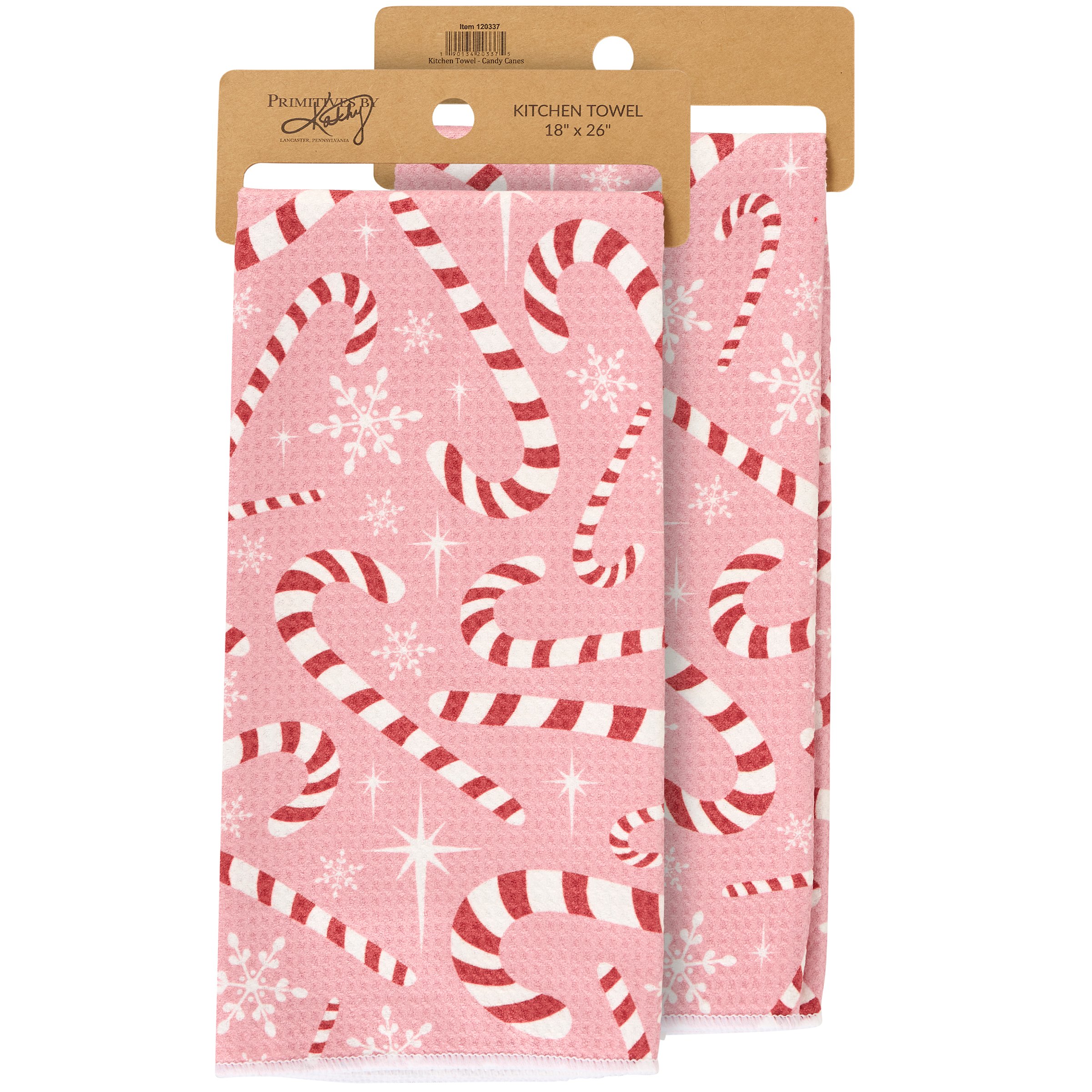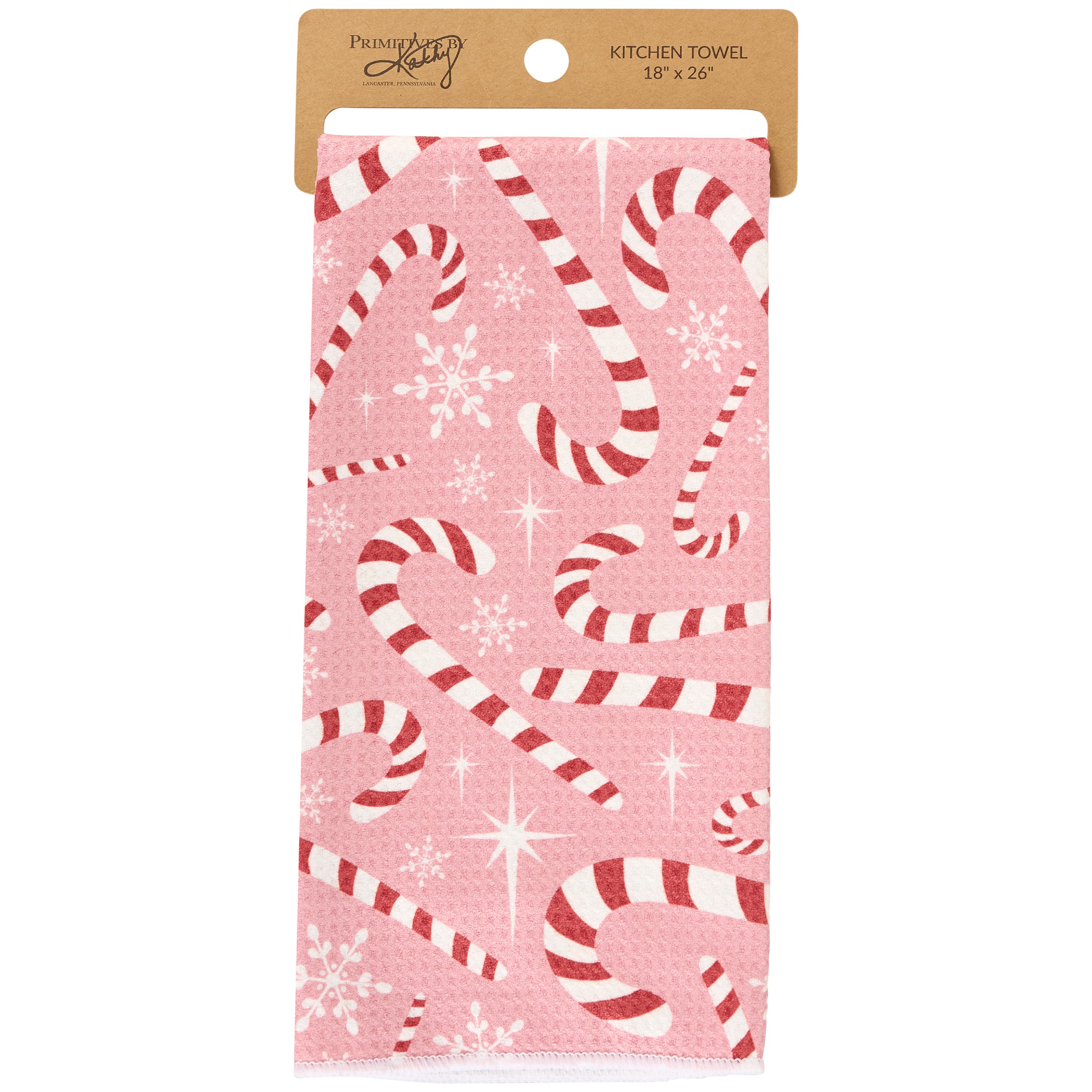 A microfiber kitchen towel from our Christmas Collection displaying an all-over design of candy canes and snowflakes in a retro pastel color palette. Our Candy Canes kitchen towel is conveniently machine-washable for easy cleaning. Seasonal kitchen towel is packaged on a cardboard hanger with hole to easily display on rack. A retro pastel Christmas kitchen accessory perfect for seasonal use.