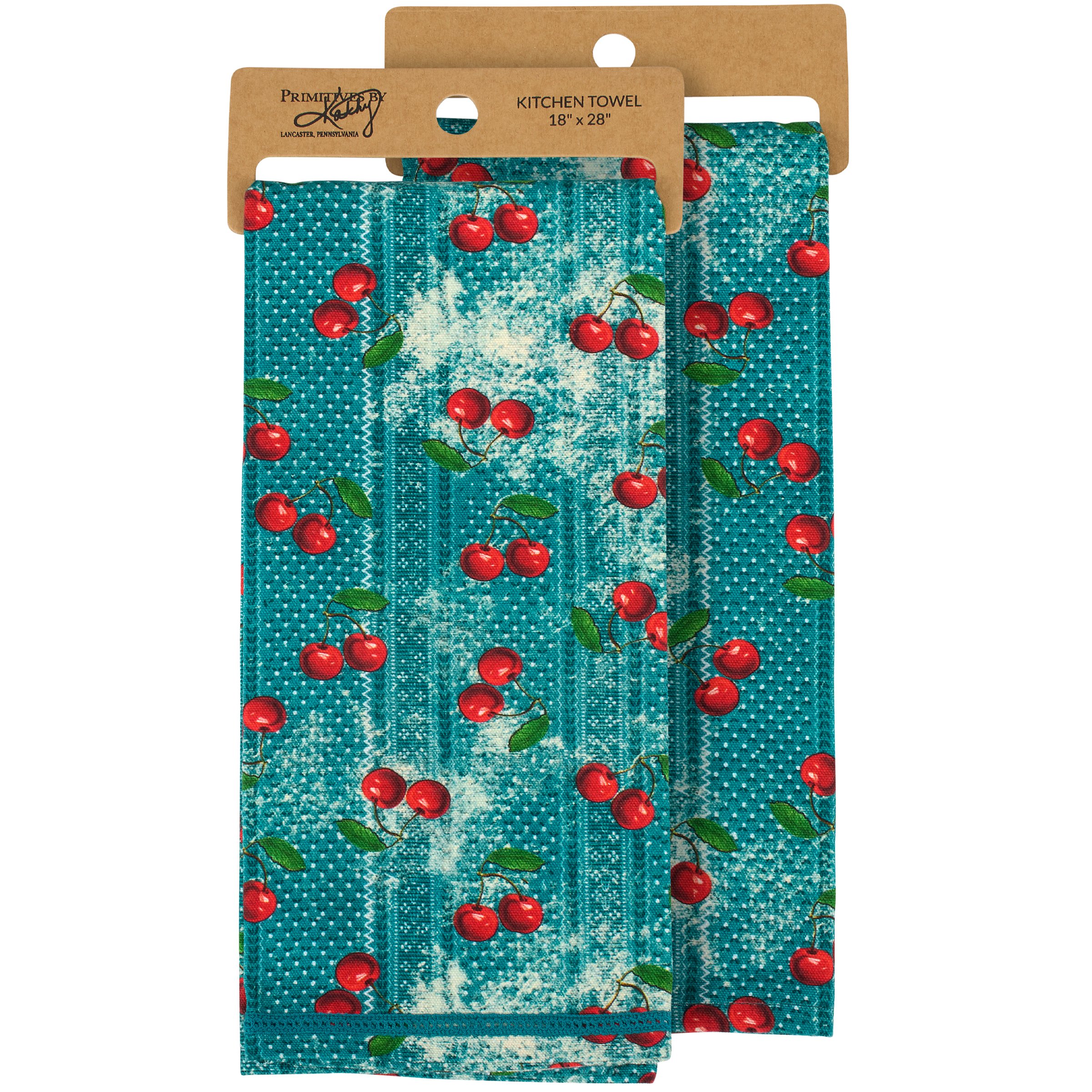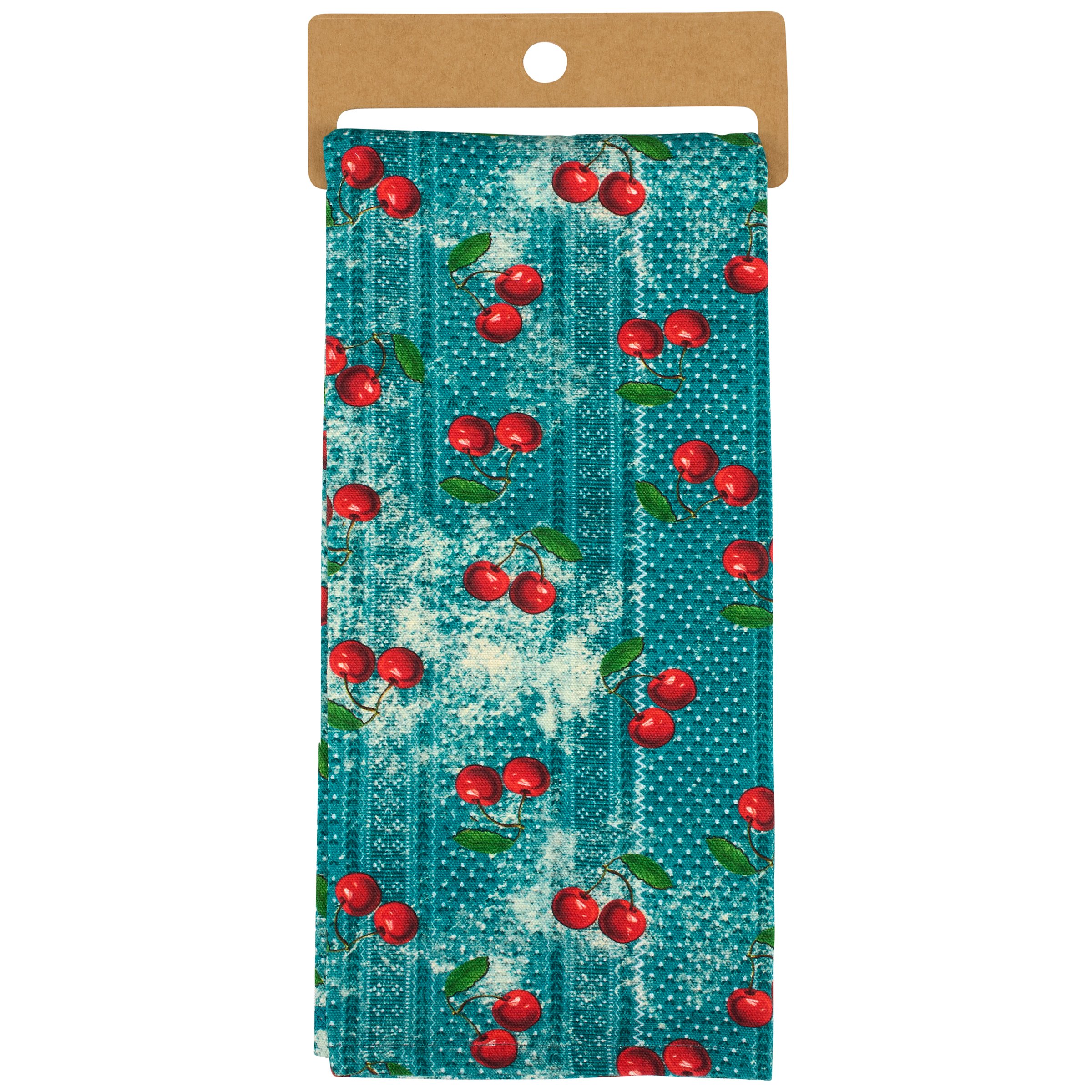 A cotton kitchen towel from our Patriotic Collection featuring an all-over design displaying a cherries on a blue pattern inspired by vintage americana decor. Our Cherries kitchen towel is conveniently machine-washable for easy cleaning. Vintage kitchen towel is packaged on a cardboard hanger with hole to easily display on rack. A vintage kitchen accessory perfect for adding personality to any kitchen.