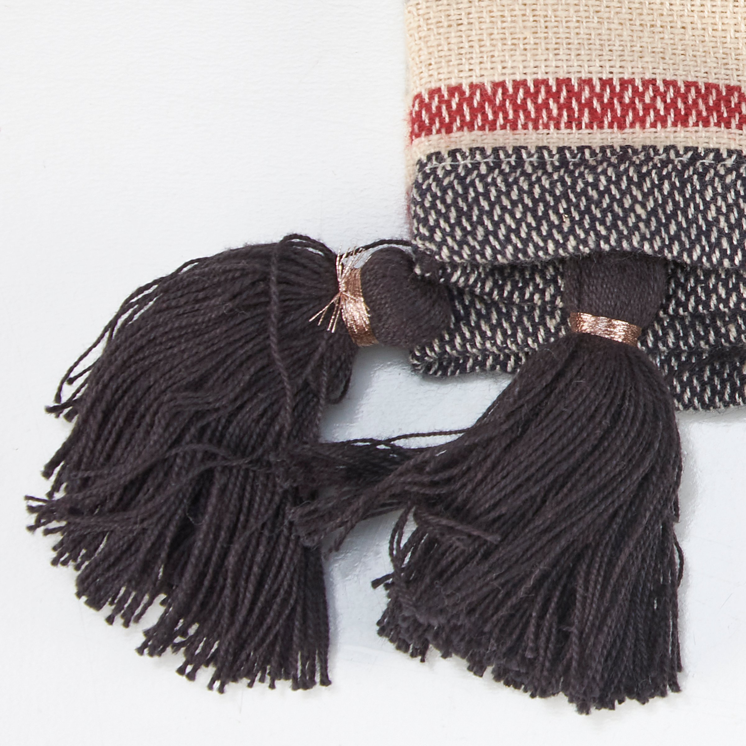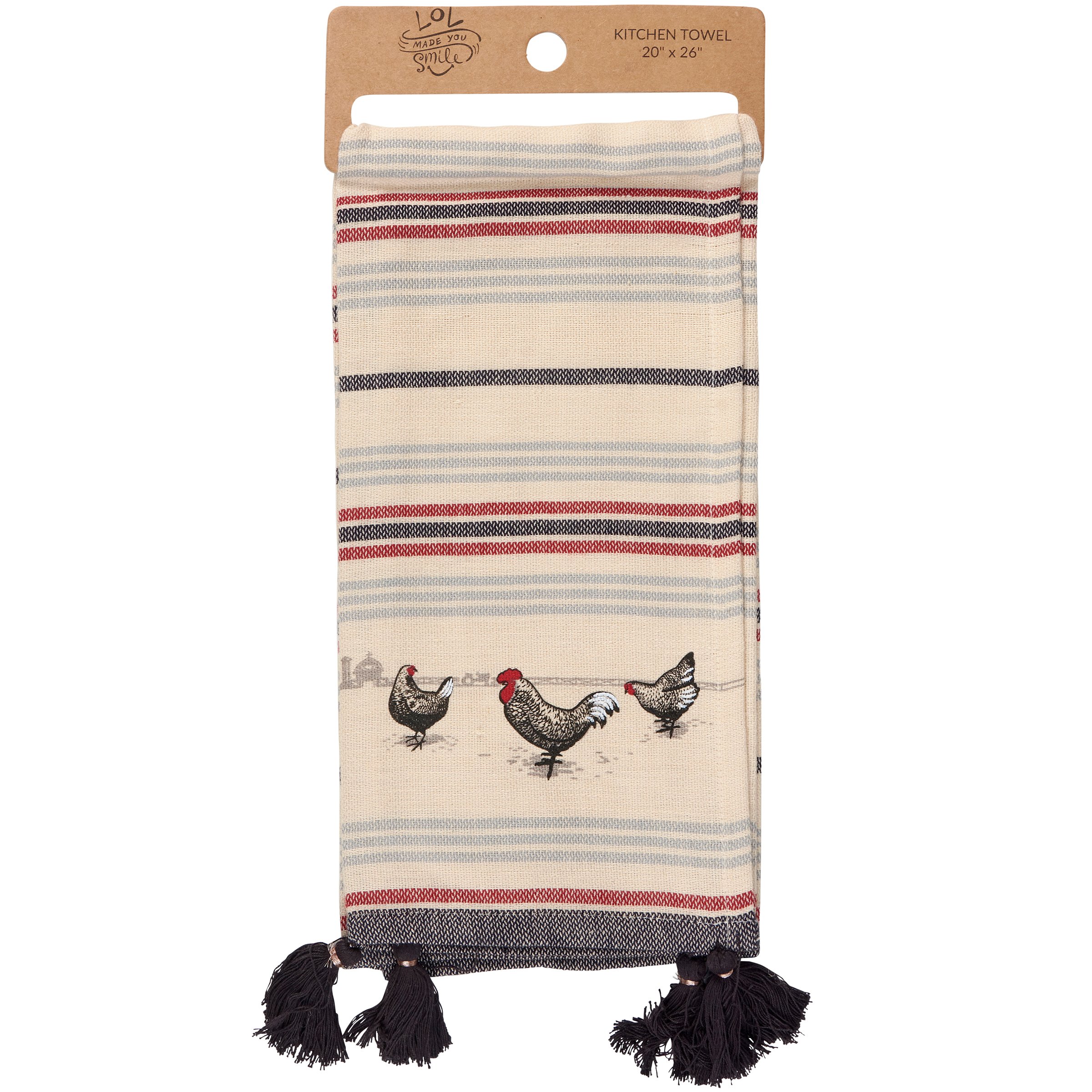 A cotton-linen blend kitchen towel from our Homestead Collection displaying coordinating colored stripes woven throughout with a design of chickens on the front. Kitchen towel features black tassels along the edge. Our Chickens kitchen towel is conveniently machine-washable for easy cleaning. Packaged on a cardboard hanger with hole to easily display on rack. A homestead inspired kitchen accessory perfect for everyday use.