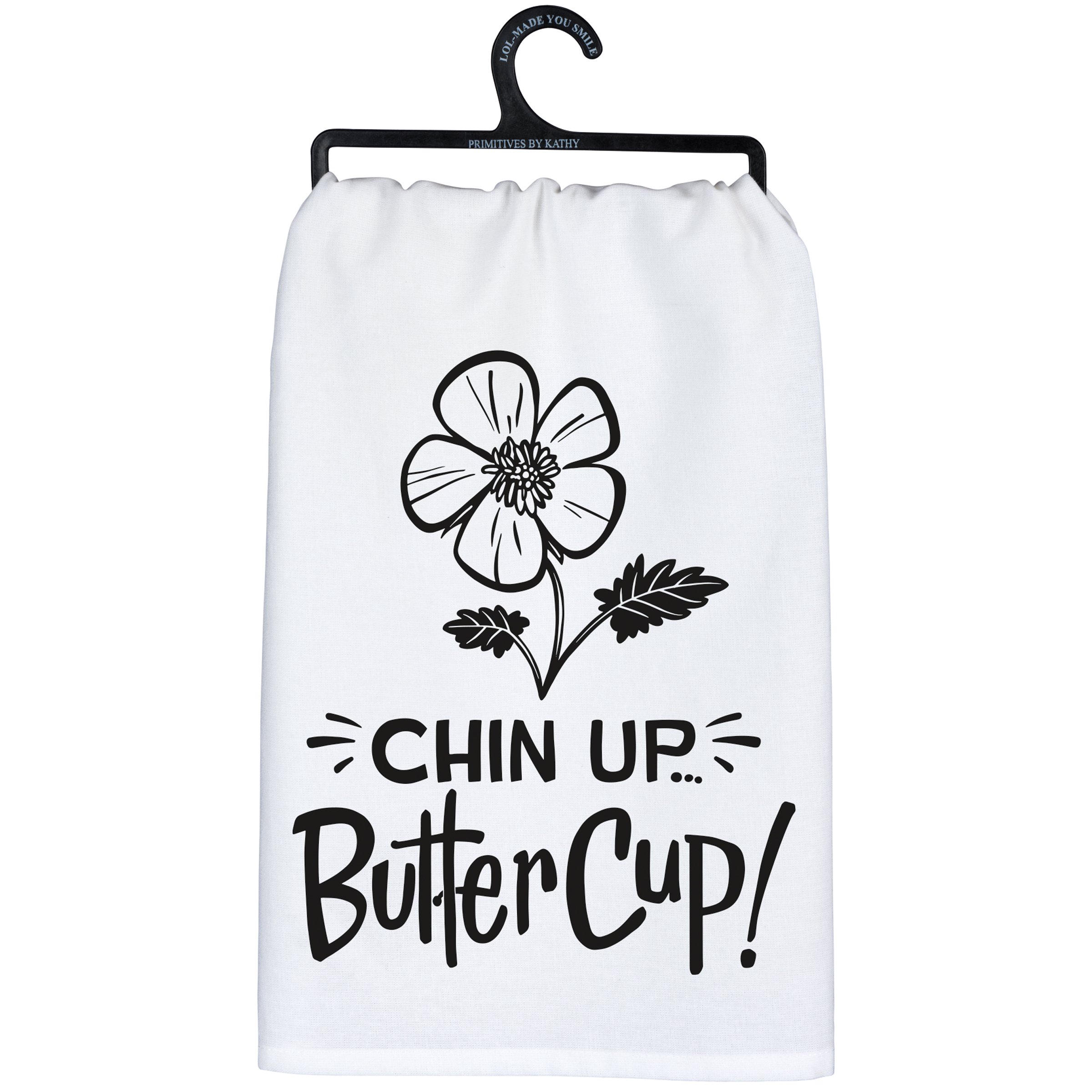A black and white cotton kitchen towel from our LOL-Made You Smile Collection displaying a fun hand illustrated design of a buttercup flower above an uplifting sentiment that reads "Chin Up Buttercup!" Our Chin Up Buttercup kitchen towel is conveniently machine-washable for easy cleaning. Inspirational kitchen towel is packaged on a black plastic hanger to easily display on rack. A fun inspirational gift perfect for an everyday kitchen accessory.