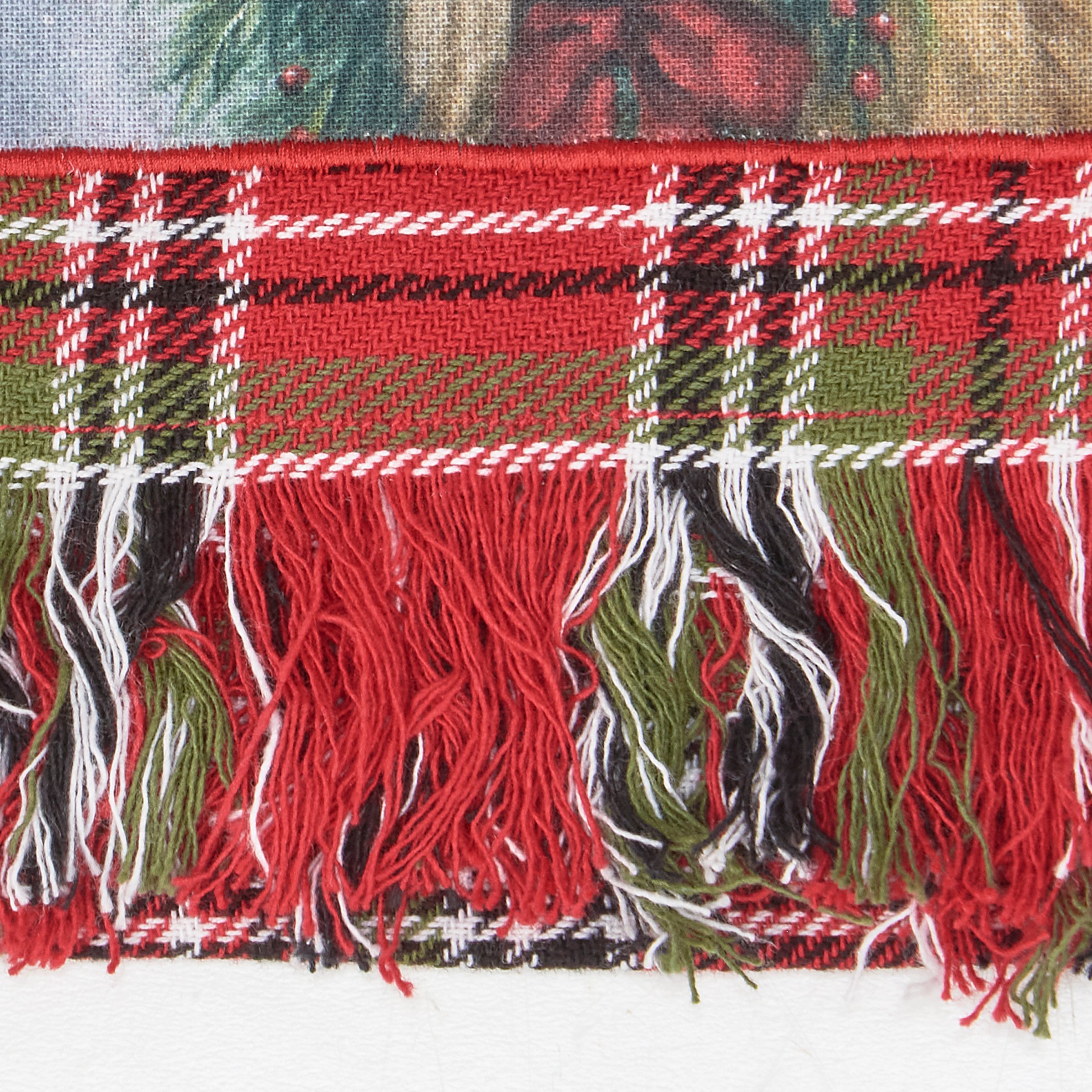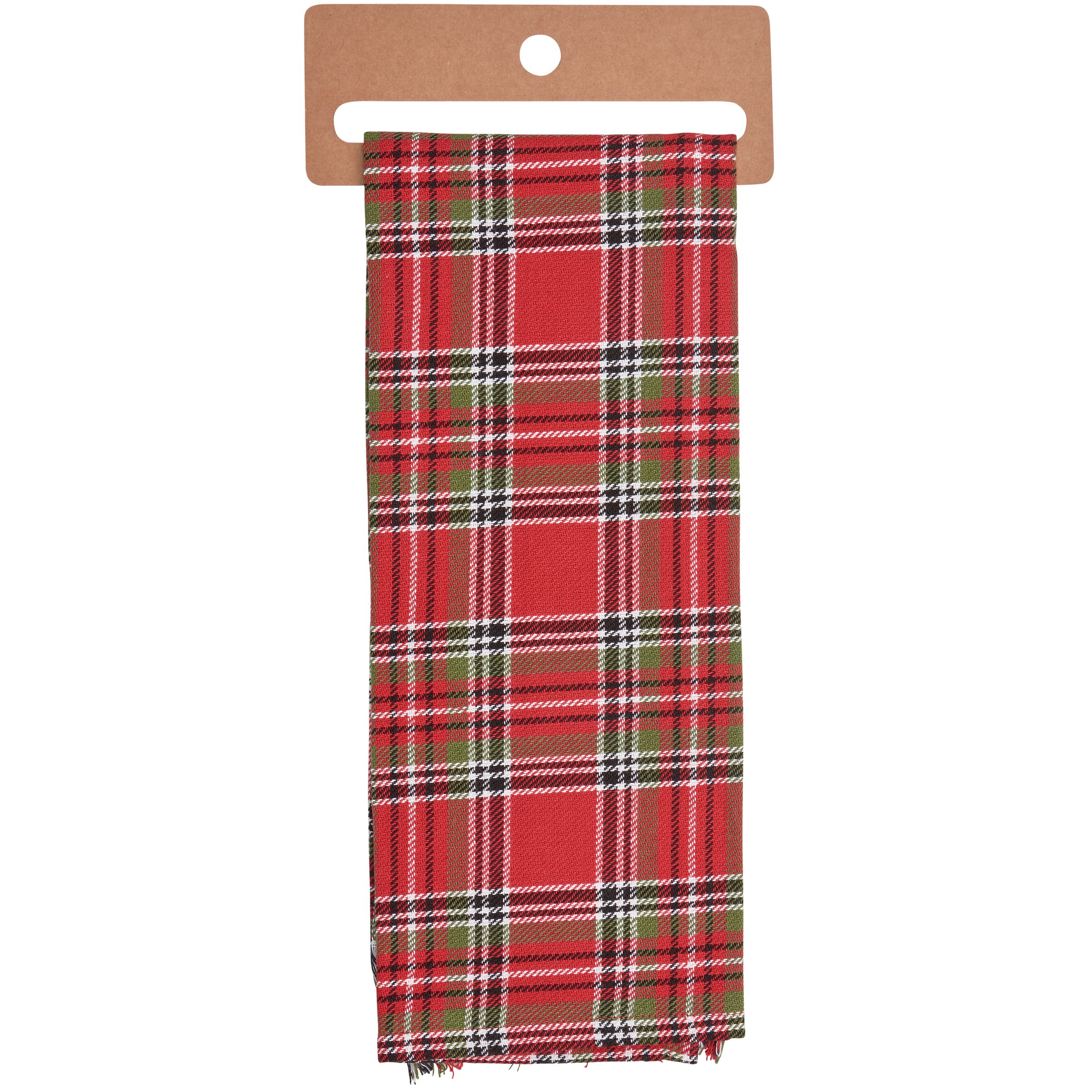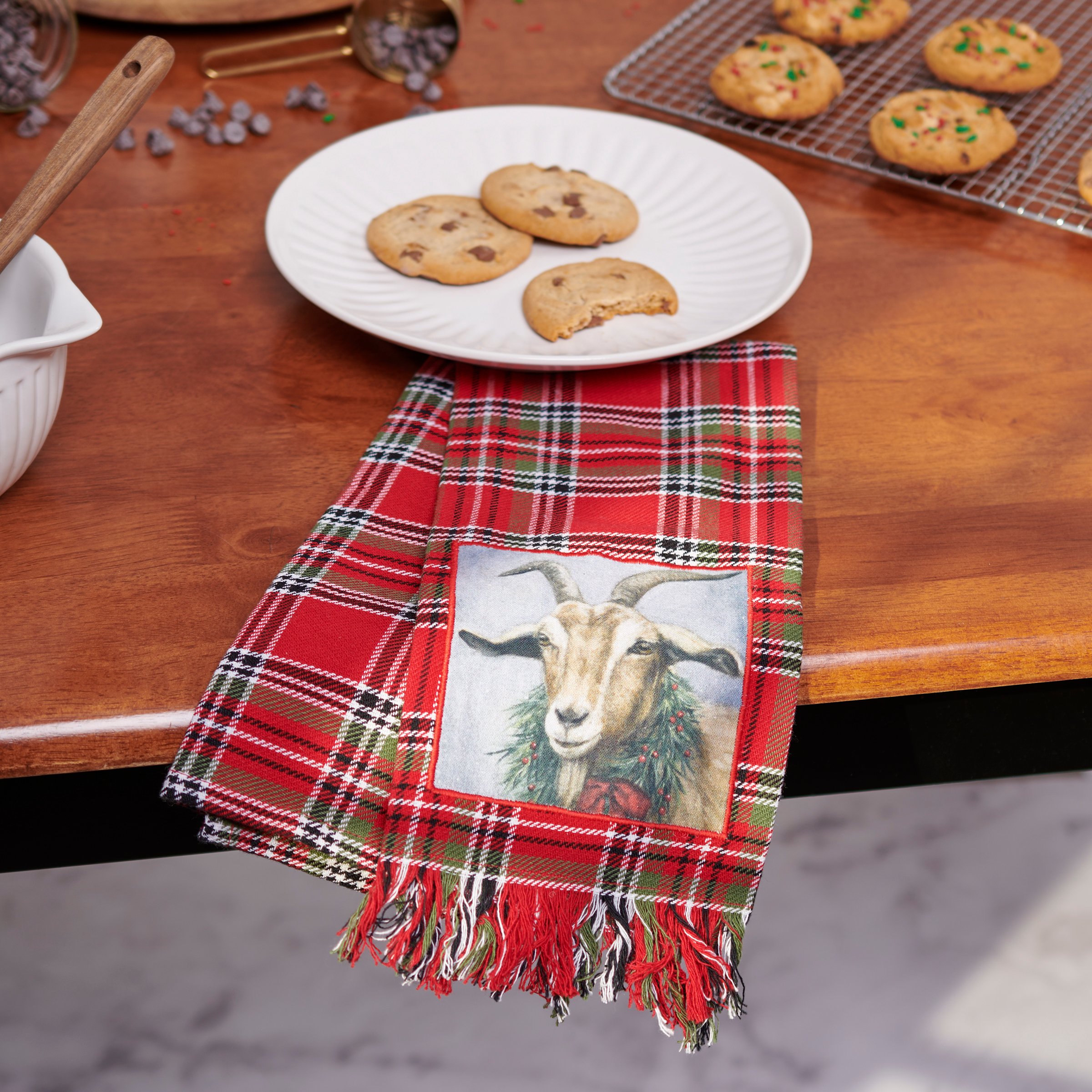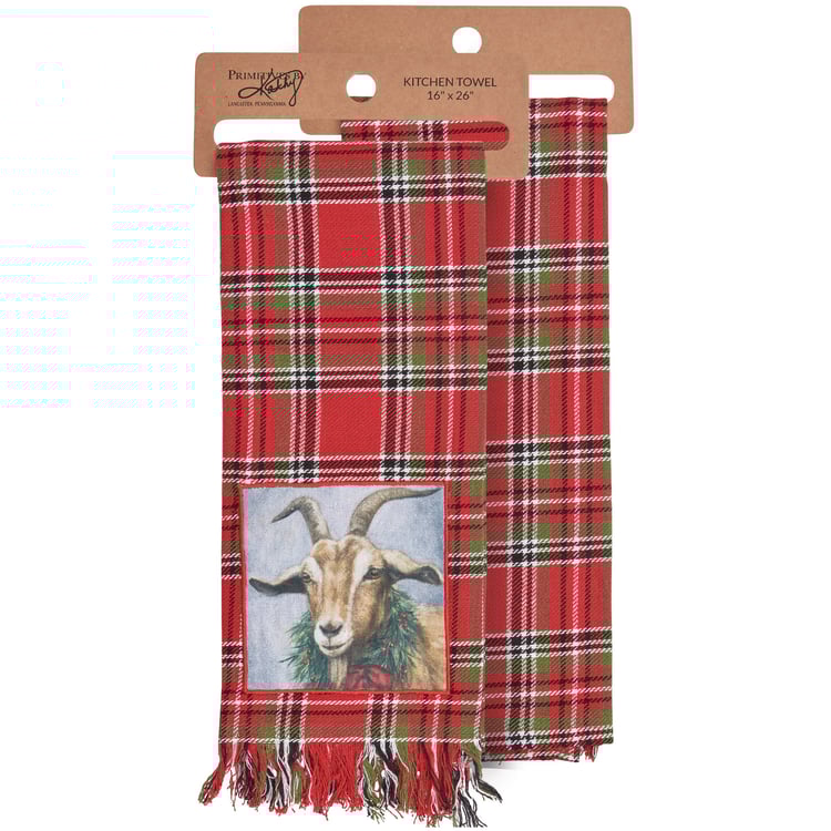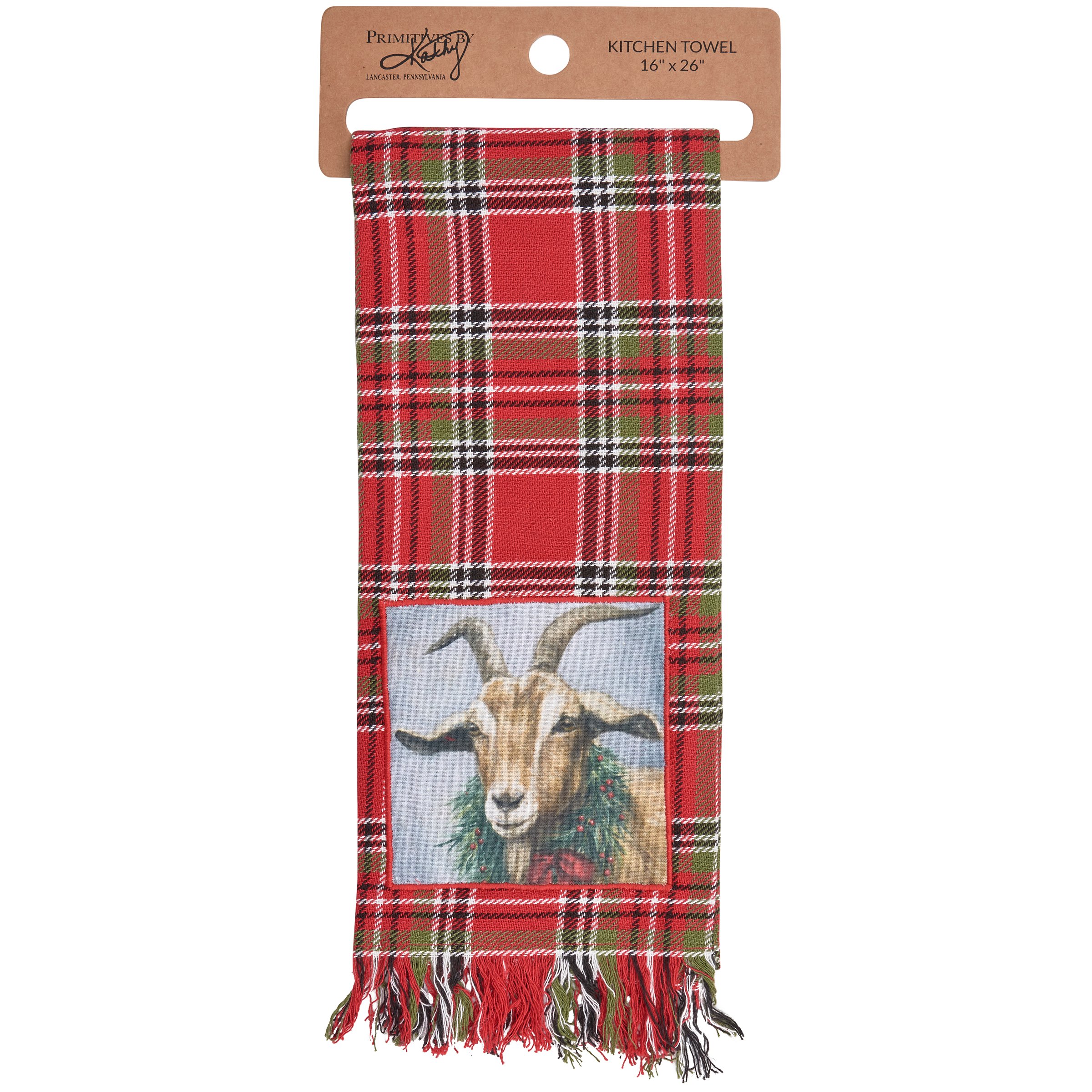 A cotton kitchen towel from our Christmas Collection featuring a stitched art panel with Christmas tartan plaid pattern all-over towel and frayed details on front trim. Art panel displays a goat wearing a Christmas wreath in a winter scene. Design is replicated from original artwork painted onto burlap canvas, giving the art a unique depth and texture. Our Christmas Goat kitchen towel is conveniently machine-washable for easy cleaning. Seasonal kitchen towel is packaged on a cardboard hanger with hole to easily hang on rack. A rustic Christmas-themed kitchen accessory perfect for seasonal use.